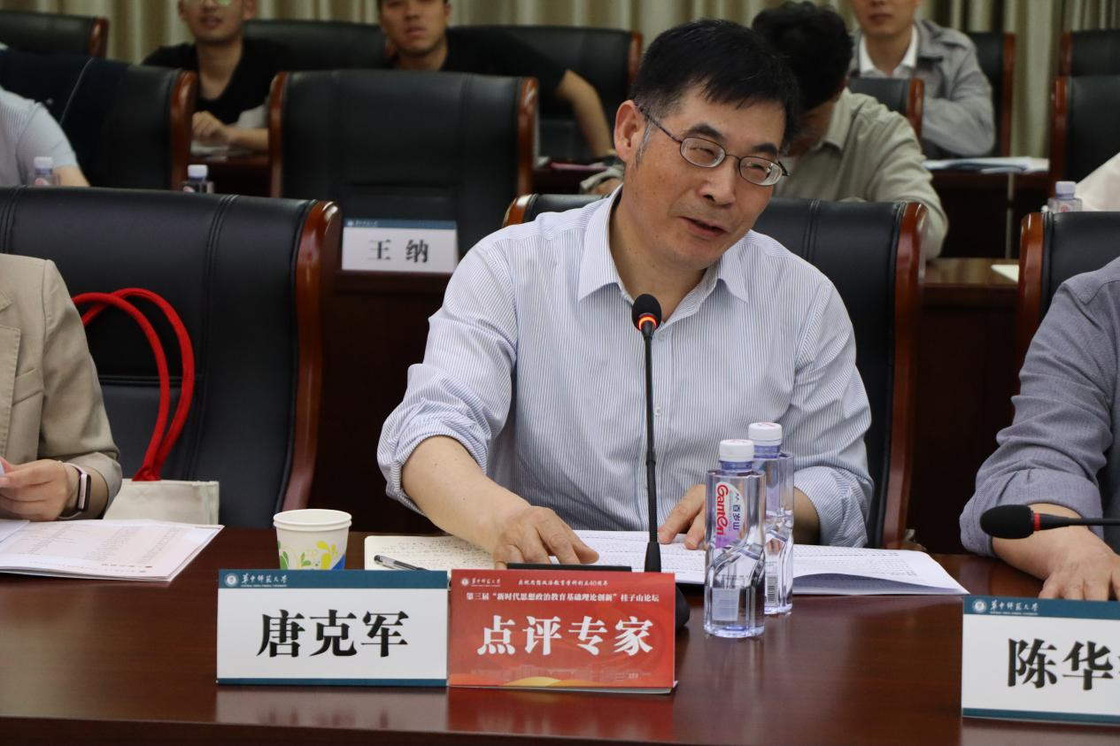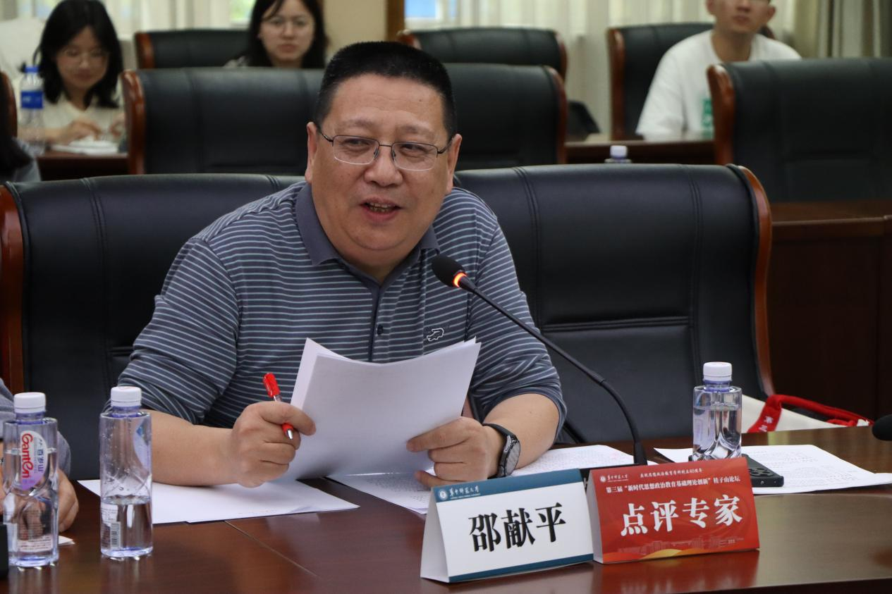 在专家点评环节,武汉理工大学马克思主义学院教授邵献平进行点评指导。他指出老师是创作主体,学生是接受主体,课堂在教学之外也是设计一个审美作品,如何做出具有使命感的思想政治理论课是教师们应当注意的问题。他从自身的课题申报出发,点出人工智能等新技术在教学实际、教学评价上运用的可行性和重要性,强调新理念在研究时应当注意的问题。