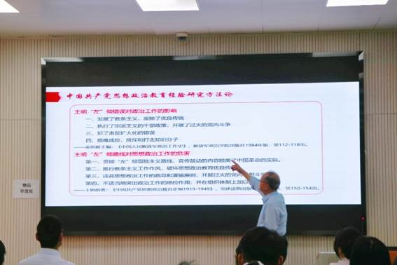 王树荫教授风趣幽默的开场迅速活跃了现场气氛,吸引同学们的目光,随后向同学们申明学术研究的态度,即“不偏听、不偏信、要兼听兼看”。本次讲座王树荫教授主要讲述了中国共产党思想政治教育经验研究的八大方法。通过横向比较多位专家对“中国共产党百年思想政治教育经验”的研究提出思想政治教育史的研究要使“主观与客观趋于一致”。从特殊矛盾和特殊研究领域出发阐述研究问题需要抓住核心概念,厘清中国共产党思想政治教育史的学科定位,指出要“紧扣学科性质与对象”。同时要注重“普遍与特殊的统一”,带领同学们明晰中国共产党的百年历史经验与中国共产党百年思想政治教育的历史经验之间的关系,强调不能用一般普遍代替特殊。