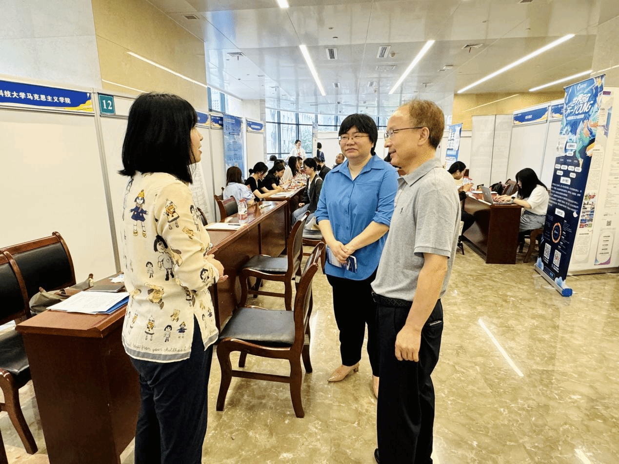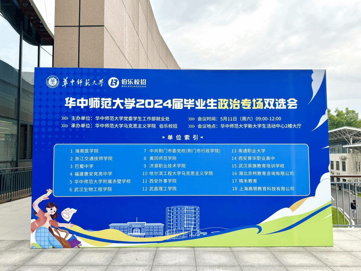 马克思主义学院讯(通讯员 赵芸逸)为深入学习贯彻习近平新时代中国特色社会主义思想和党的二十大精神,全面落实党中央、国务院对高校毕业生就业创业工作的决策部署,落实教育部《关于做好2024届全国普通高校毕业生就业创业工作的通知》要求,进一步促进马克思主义学院毕业生及我校政治类毕业生更精准、更充分和高质量就业,5月11日,华中师范大学党委学生工作部就业处、马克思主义学院于新大学生活动中心2楼大厅举办“策马‘职’行”政治类专场双选会,华中科技大学马克思主义学院、哈尔滨工程大学马克思主义学院等高校,襄阳二十四中、巴蜀中学等中学共计23家单位和我校140余名本、硕、博政治类毕业生参加。校党委学生工作部就业处处长王茂胜、马克思主义学院党委书记孙永祥、马克思主义学院党委副书记邵莉莉等莅临双选会现场,与用人单位和学生进行交流并洽谈就业事宜。