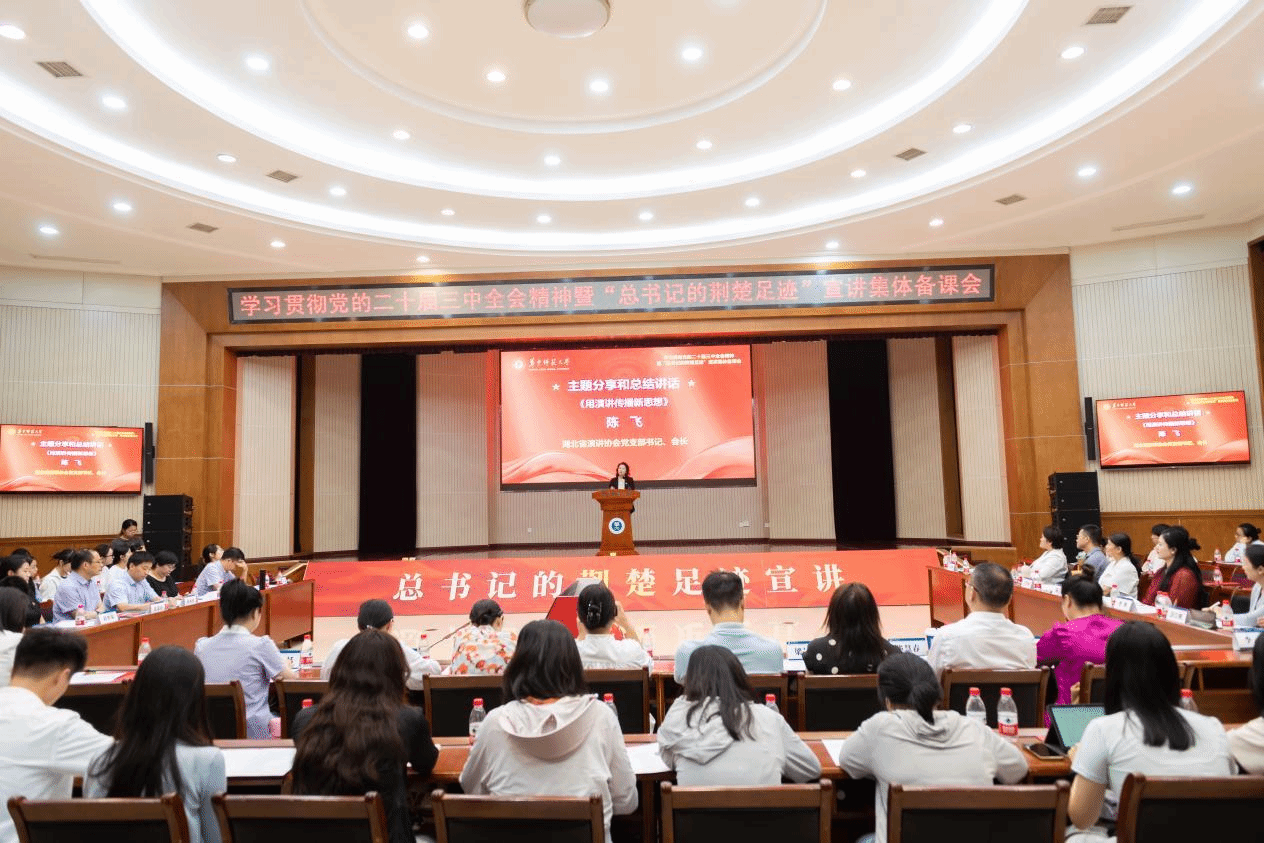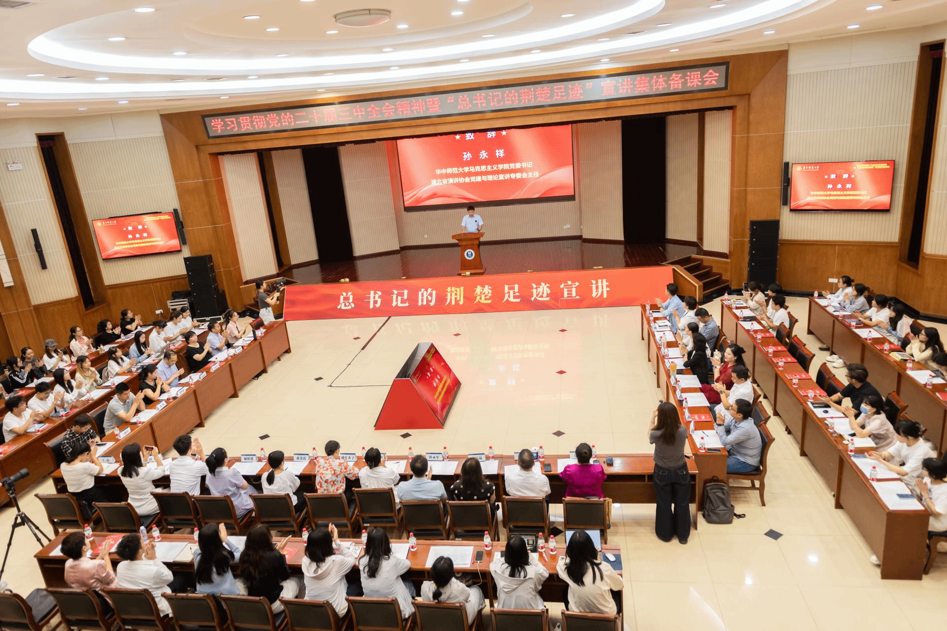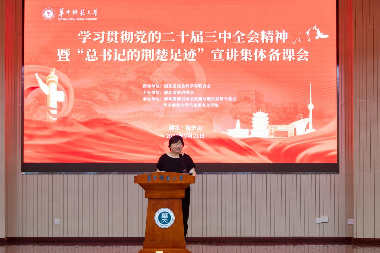 马克思主义学院讯(通讯员 余扬扬 张梦婷;摄影 陈希昌 倪海佳 王梓桐)9月21日,学习贯彻党的二十届三中全会精神暨“总书记的荆楚足迹”宣讲集体备课会在华中师范大学科学会堂一楼报告厅举行。湖北省演讲协会党支部书记、会长陈飞,湖北省演讲协会副会长、汉阳区政协委员曹辉,湖北省演讲协会副会长、武汉市公安局经开分局党委委员、政治处主任陈晓波,湖北省演讲协会副会长、江汉大学马克思主义学院党委书记吕洪雁,湖北省演讲协会秘书长、湖北广播电视台新闻评论员尹华正,湖北省演讲协会理事、新洲区教育局宣传培训科负责人彭江帆,湖北省演讲协会理事、中建三局演讲协会秘书长胡洁,湖北省演讲协会副秘书长蒋渝,华中师范大学马克思主义学院党委书记、湖北省演讲协会党建与理论宣讲专委会主任孙永祥,华中师范大学马克思主义学院理论宣传与社会服务部长、湖北省演讲协会党建与理论宣讲专委会副主任兼秘书长徐秉国等参加会议。华中师范大学马克思主义学院党委副书记、纪委书记,湖北省演讲协会党建与理论宣讲专委会副主任邵莉莉主持会议。