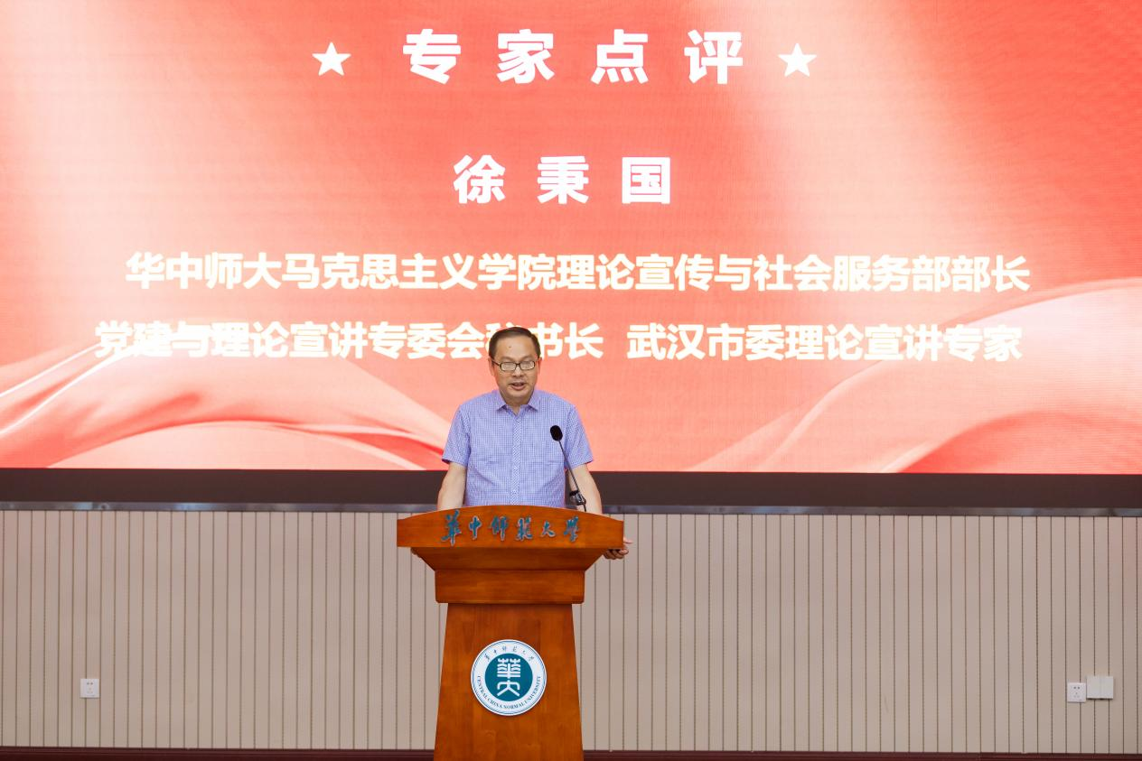 集体宣讲结束,华中师范大学马克思主义学院理论宣传与社会服务部部长、湖北省演讲协会党建与理论宣讲专委会副主任兼秘书长徐秉国对本次主题宣讲进行了点评。他用“宣”、“讲”、“微”三个字分别概括本次主题宣讲所体现的政治性、哲理性和多样性,对五位宣讲者给予了充分肯定,并表示理论宣讲应当紧密联系人民群众,让党的理论“飞入寻常百姓家”。