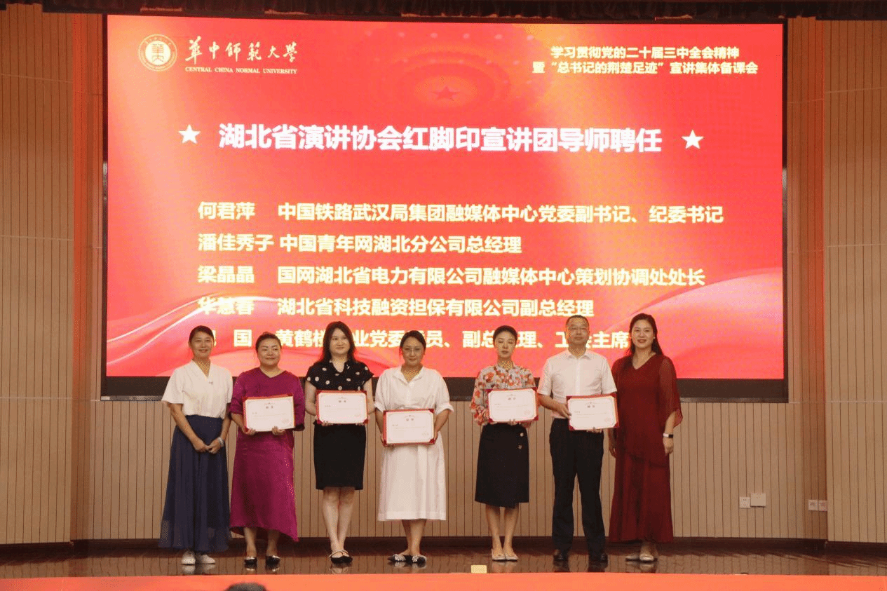 随后,会议进入第三阶段。湖北省演讲协会理事、新洲区教育局宣传培训科负责人彭江帆和湖北省演讲协会理事、中建三局演讲协会秘书长胡洁为湖北省演讲协会红脚印宣讲团宣讲员游金霞、刘梦觉、田静、谢昕恬、江润姿颁发聘书。湖北省演讲协会副会长、武汉市公安局经开分局党委委员、政治处主任陈晓波和湖北省演讲协会副会长、江汉大学马克思主义学院党委书记吕洪雁为湖北省演讲协会红脚印宣讲团第三批导师何君萍、潘佳秀子、梁晶晶、华慧春、魏国颁发聘书。最后,全体参会人员在科学会堂门口进行合影留念,本次学习贯彻党的二十届三中全会精神暨“总书记的荆楚足迹”宣讲集体备课会圆满结束。