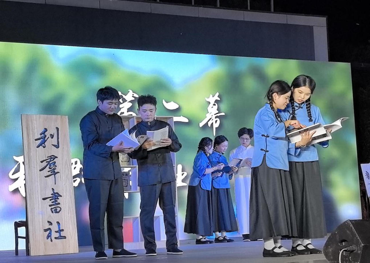 华中师范大学习近平新时代中国特色社会主义思想学生研习社带来了原创沉浸式舞台剧《你好,恽代英》。在展演过程中,参演成员通过《国不可以不救》《利群书社开张日》《<中国青年>办刊交流会》《恽代英英勇就义》四幕的展演,生动再现了“五四运动”时期恽代英坚持探索中国革命道路,找到救国真理——马克思主义,并在这一过程中启发与引导进步青年走上革命道路的故事,带领现场观众走进恽代英等革命先烈传奇、辉煌的人物故事世界。表达了我院青年学子对革命先烈恽代英的深切缅怀之情及继承恽代英革命遗志的坚定决心,展现出新时代好青年的昂扬斗志与弘扬伟大建党精神的坚强决心。