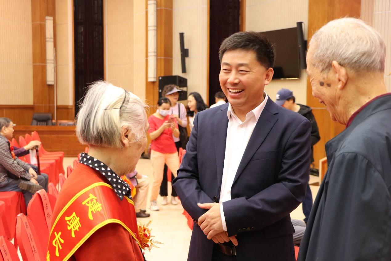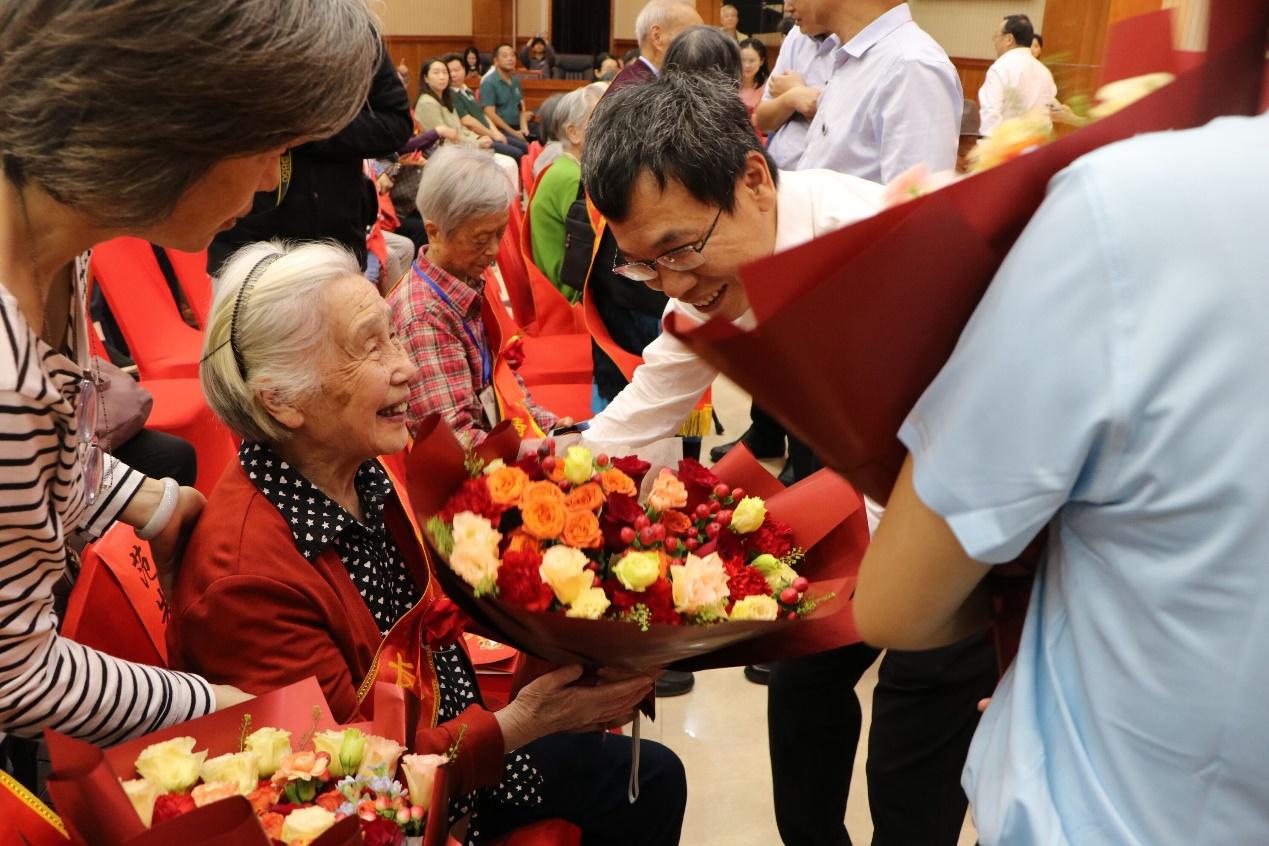 最后,全体校领导向90岁寿星献花祝寿,青年学生代表向70岁、80岁老人们献花祝寿。此次祝寿活动圆满结束。