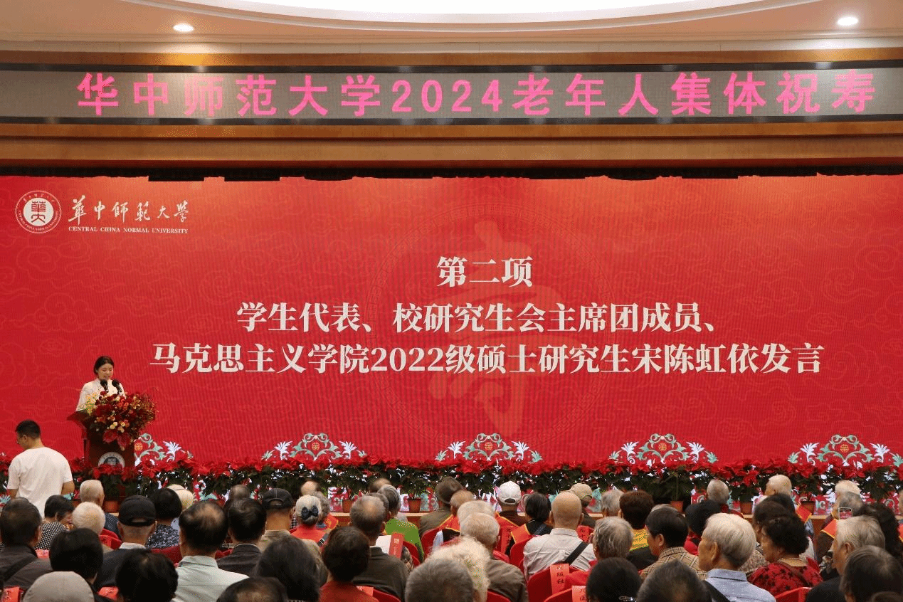 会议第二项,青年学生代表、校研究生会主席团成员、马克思主义学院研究生宋陈虹依为老同志们献上祝寿词。百廿华师,虽受风雨,仍岿然屹立,这其中是老教育者们坚守传承的师者之道。宋陈虹依代表青年学子表达了对前辈们的敬仰和感谢,也提出了新一代学子的展望和奋斗目标:“我们必将继承前辈们的优良传统,大力弘扬教育家精神,勇担历史使命,锤炼品德修养,提升专业本领,争做有理想、敢担当、能吃苦、肯奋斗的时代新人,在实现中华民族伟大复兴的洪流中,为推进中国式现代化,加快建设教师教育一流大学而奋斗。”