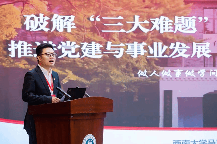 全国党建工作标杆院系、西南大学马克思主义学院党委书记吴文杰以“破解‘三大难题’,实现‘三度提升’——推进党建与事业发展‘一融双高’的院本实践”为主题,介绍了学院破解党建工作“宽松软”“断头路”“两张皮”三大难题,实现“三大提升”的典型做法。