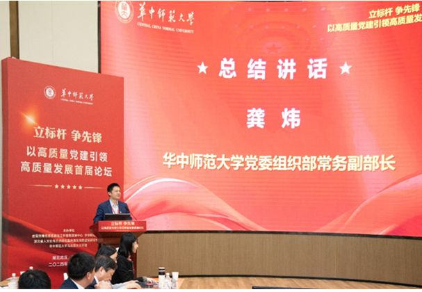 华中师范大学党委组织部常务副部长龚炜作总结讲话,他向参加论坛的领导、专家表达了感谢,并对此次论坛的丰硕成果进行了全面总结,对各个交流单位的典型做法进行了进一步推介,对未来高校党建持续推进“一融双高”工作进行了展望,提出加强顶层设计,构建以高质量党建引领高质量发展的新格局,夯实基层基础,激发以高质量党建引领高质量发展的新动能,强化党建赋能,塑造以高质量党建引领高质量发展的新优势,并寄希望打造高校党建高质量发展新局面。