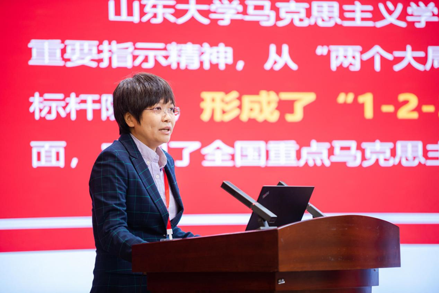 全国党建工作标杆院系、山东大学马克思主义学院党委书记鞠晗以“强学院 强学科 强课程 以高质量党建引领全国重点马院跨越式发展”为主题,介绍了该院党建“1-2-3-4”工作思路,从强学院、强学科、强课程等展开,介绍了以高质量党建引领全国重点马院跨越式发展的做法。