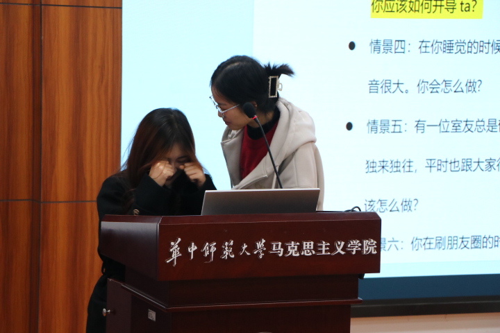 最后,培训进入情景扮演环节,学生代表对“室友考试发挥失常而在宿舍哭诉”和“室友因专业学习等因素感到压力重大,情绪低迷”的具体情境进行现场演示和处理,她们的情景扮演结合了本次培训的内容,提出了真实有效的处理办法。