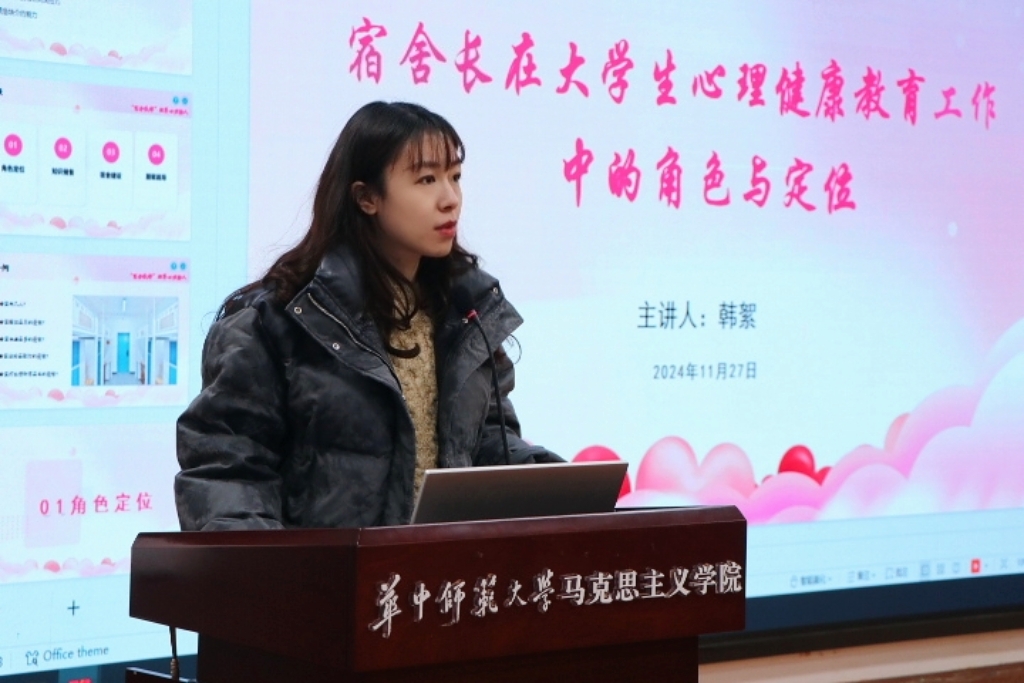 马克思主义学院讯(通讯员 任玉佳;摄影 蒋林杉)为充分保障学生的心理健康,明确宿舍长的角色定位与责任,营造和谐健康的校园氛围,华中师范大学马克思主义学院于2024年11月27日中午在一号楼1101教室举办题为《宿舍长在大学生心理健康教育工作中的角色与定位》的宿舍长培训活动。本次培训由马克思主义学院辅导员韩絮主讲,2024级本科生和研究生宿舍长参加。