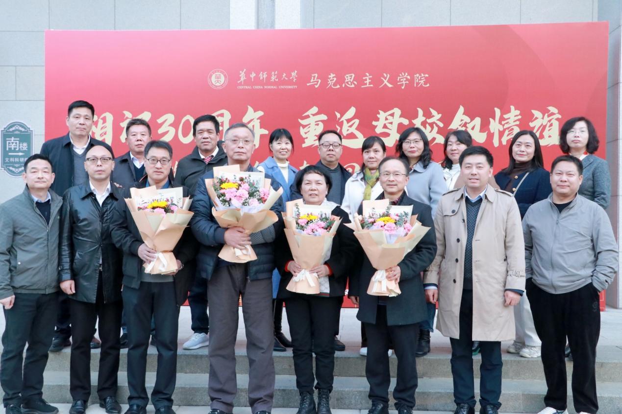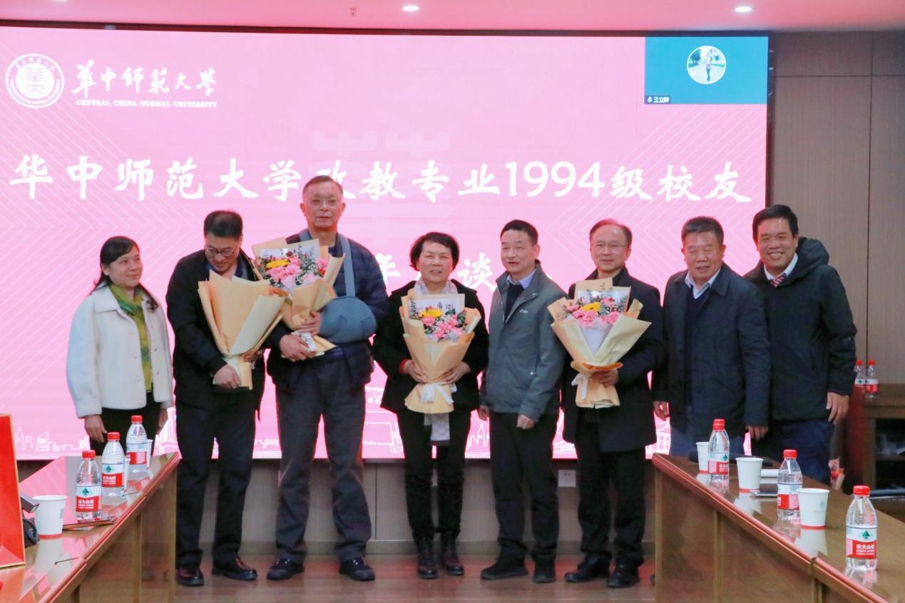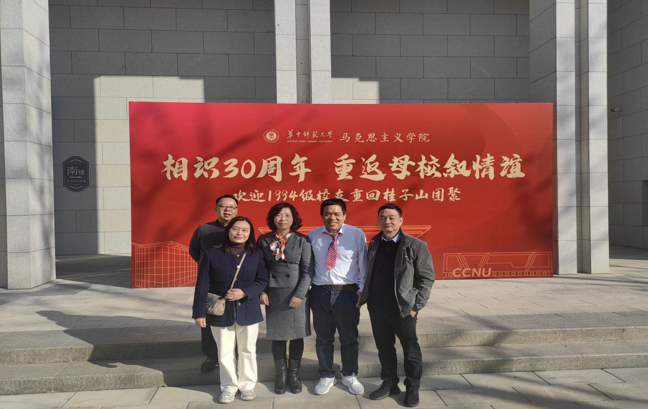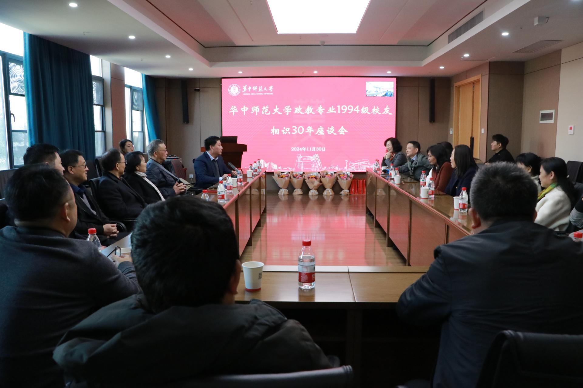 马克思主义学院讯(通讯员 易泽元;摄影 任玉佳)11月30日,华中师范大学政教专业1994级校友相识30年座谈会在学校文科科研楼407会议室举行。时任学院领导和授课教师代表郭红霞、王茂胜、陈华洲、高杨帆等出席座谈会,马克思主义学院党委书记孙永祥、院长毛华兵和政教专业1994级校友参加,座谈会由政教专业1994级校友徐俊川主持,以线上线下相结合的方式进行。