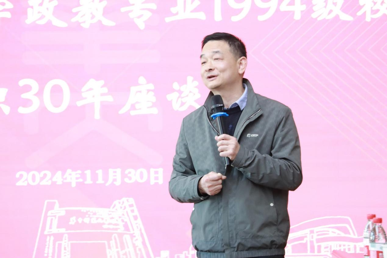 恩师代表讲话结束后,马克思主义学院院长毛华兵作总结发言。毛华兵在发言中回忆了自己在桂子山求学、工作的经历,表达对教师们的感谢,希望各位校友能够持续关注与支持学校与学院发展,并期待1994级校友能够再次相聚于桂子山。