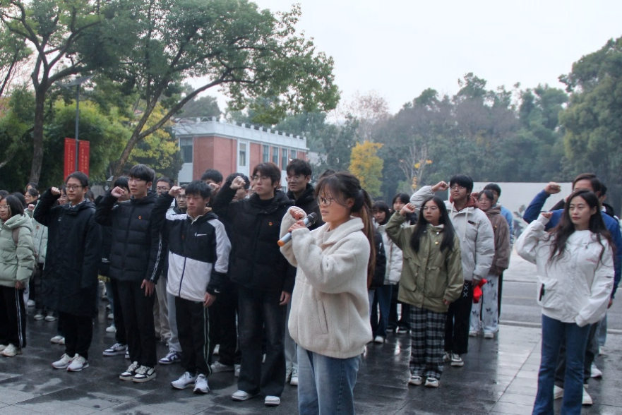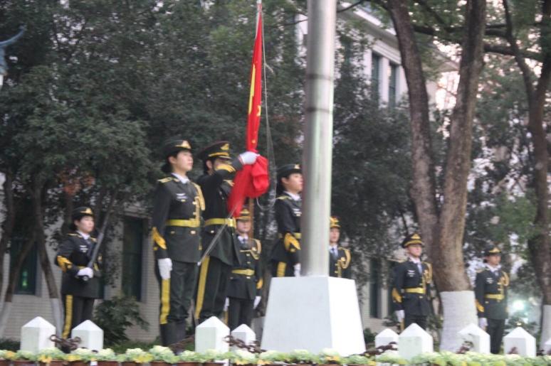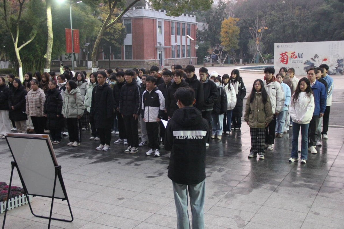 晨曦初破,6点30分 的文华公书林,马克思主义学院各团支部已整齐列队。在庄严的升旗仪式中,国旗护卫队身姿挺拔、步伐铿锵,护送国旗稳步迈向升旗台。国歌奏响之际,五星红旗迎着凛冽寒风徐徐升起,全体师生昂首凝视,在激昂嘹亮的国歌声中肃穆而立。