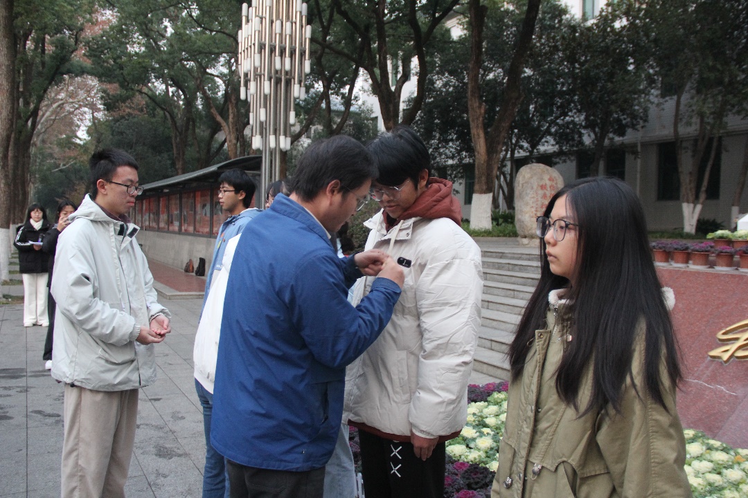 继而,马克思主义学院团委书记李欣、辅导员赵芸逸为2024级本科生团员代表佩戴团徽。