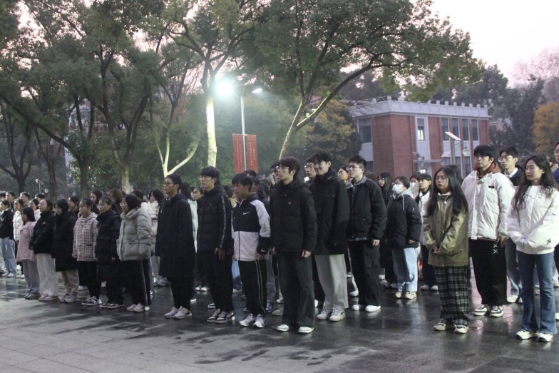 升旗仪式毕,全体师生向南京大屠杀遇难同胞沉痛默哀,心底铭刻“勿忘历史,吾辈自强”的警示。空气中弥漫着凝重庄严的气息,唯余敬意与追思在这一方天地间深沉回荡。