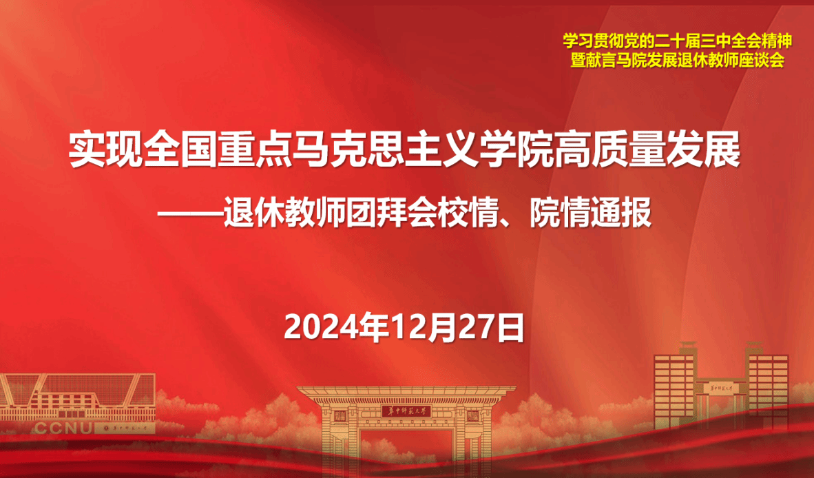 马克思主义学院党委书记孙永祥作《深入学习贯彻党的二十届三中全会精神》主题报告,围绕全会召开的主题、进一步深化改革的重要举措,特别是涉及教育科技人才和民生领域改革等进行了全面解读,并结合全国教育大会精神进行阐述。同时,还进行了校情院情通报,从校领导班子人员调整和分工调整、新校区建设推进情况以及学院行政班子、党委会换届情况等进行了通报。最后对退休教师的慰问工作做出了情况说明。
