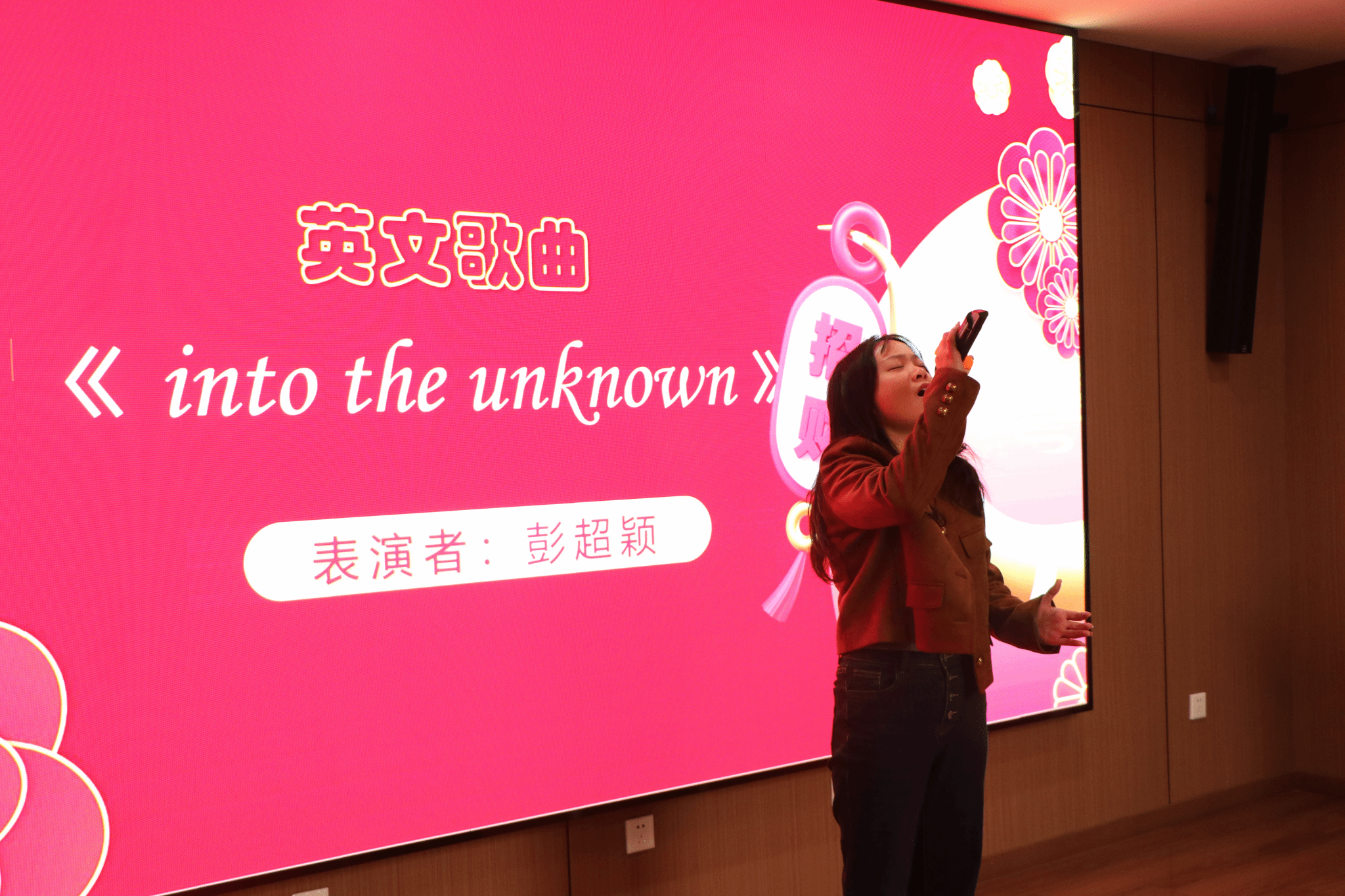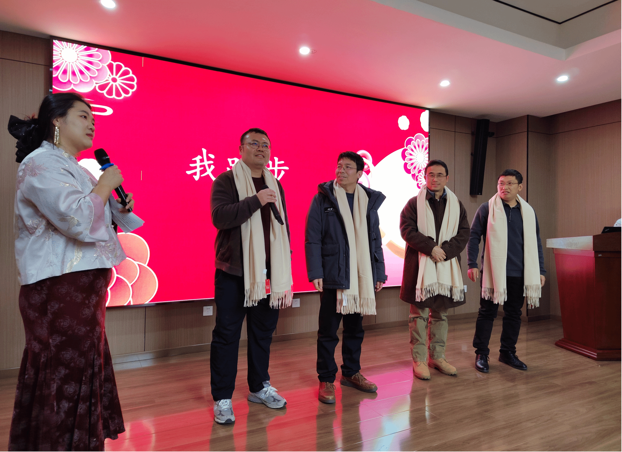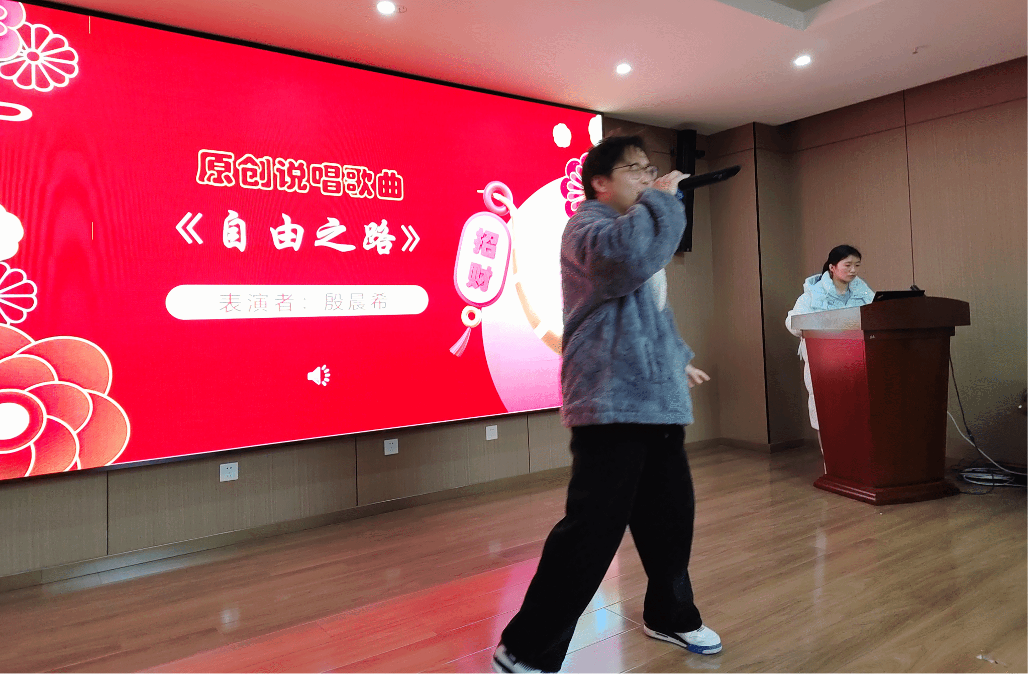 接下来的表演环节中,24年入职教师代表毕学进、向东旭、高红兵三位老师首先带来了原创曲艺节目——三句半《贺新年》,三位老师欢快有趣的表演赢得了满堂喝彩,很快将会场的气氛推向高潮;22级硕士研究生殷晨希带来原创说唱歌曲《自由之路》,以颇具动感的歌声表达了对老师们的美好祝愿,赢得了在场老师的阵阵掌声;23级硕士研究生彭超颖带来英文歌曲《into the unknown》,用高昂的歌声传达了勇于突破自己、探索未知的意蕴。