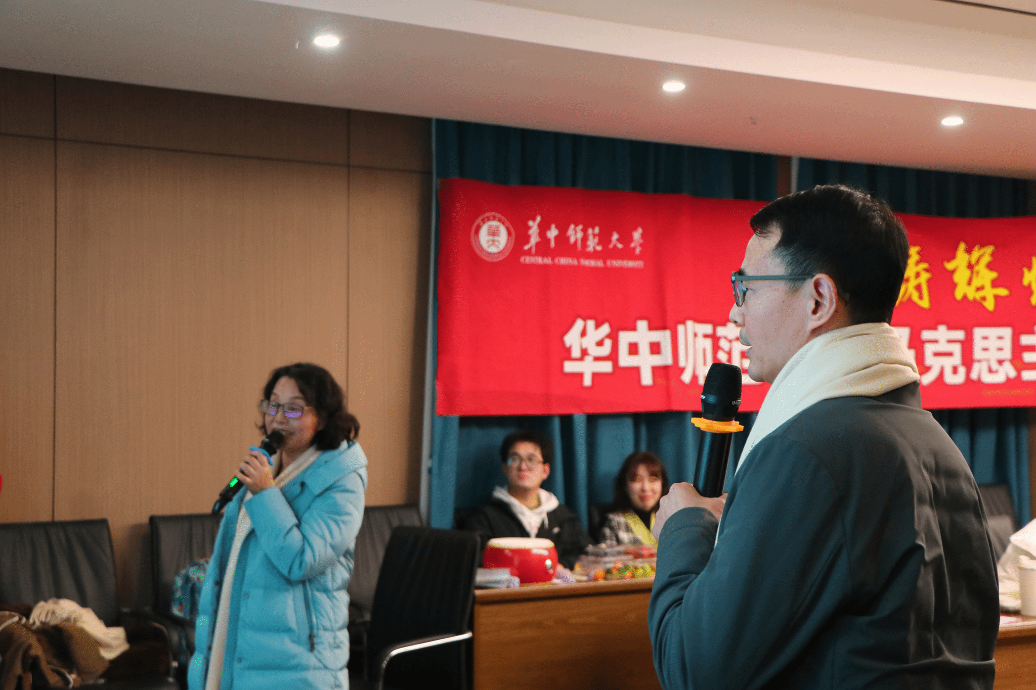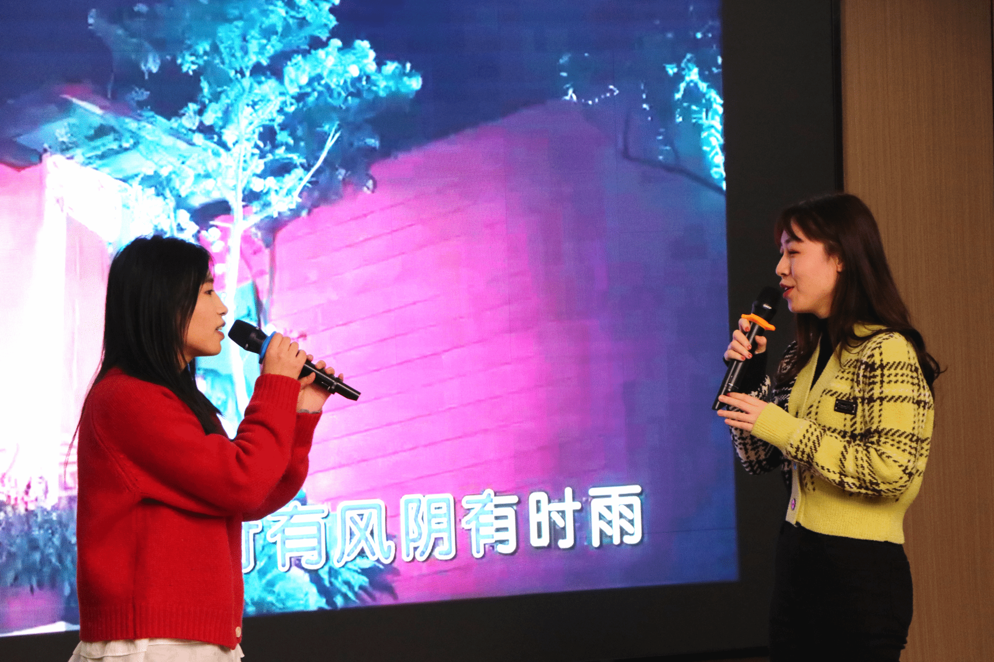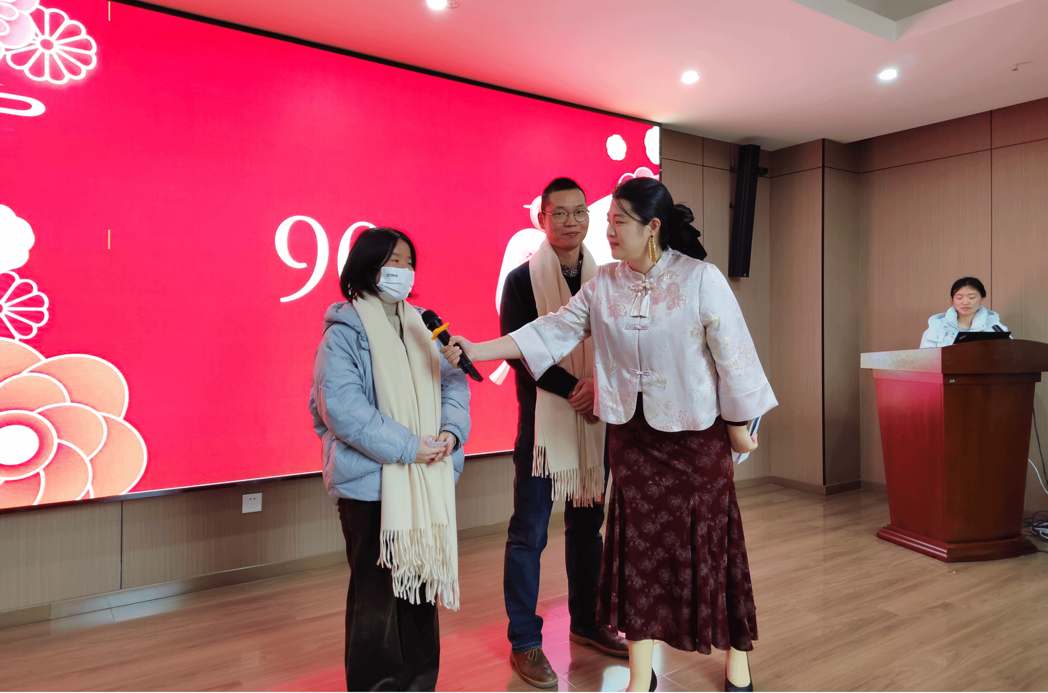 本科生辅导员韩絮、方倩带来歌曲《岁月神偷》,在歌声中祝愿老师们在有限的时间里把生活过得越来越精彩;23年入职教师代表钟毓书老师演唱的歌曲《何必诗债换酒钱》则将会场的氛围推向又一个高潮,在场的老师们纷纷报以热烈的掌声;龙静云老师带来歌曲《花西子》,用这首歌表达她对在场各位老师最美好的祝福与祝愿。在热烈、激动的会场氛围中,何家伟、熊彩云老师临时登场,为全体教职工老师献唱歌曲《可可托海的牧羊人》,他们的歌声令人陶醉,赋予了整首歌曲别样的魅力。