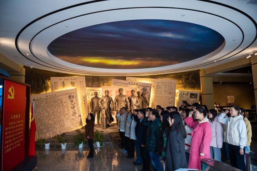 在武汉龙源红色报刊博物馆大厅,我院习近平新时代中国特色社会主义思想概论教研部党支部书记董小红带领全体师生党员重温入党誓词,面向党旗庄严宣誓。铮铮誓言时刻警醒着每一位党员牢记初心使命,坚定理想信念。