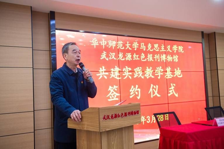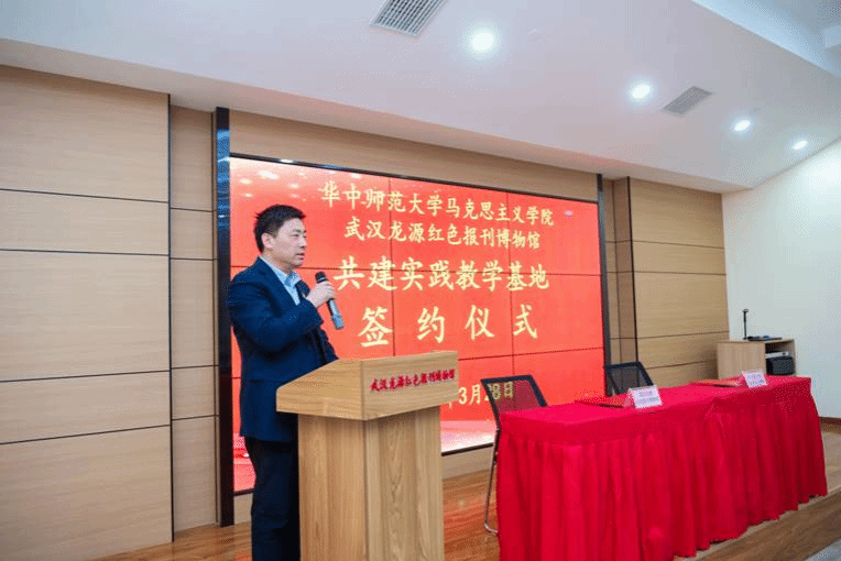 武汉龙源红色报刊博物馆馆长刘新致辞,他介绍了“没有共产党就没有新中国——红色报刊展”的展陈情况,并交流了深入学习贯彻习近平总书记关于思政课建设的重要论述的认识和体会,提出十分乐意与华中师范大学马克思主义学院一起,充分发挥红色报刊展的育人作用,提供大学生教育实践平台,并以此推进深层次的合作,共同加强实践教学基地建设,推进“大思政”育人工作。