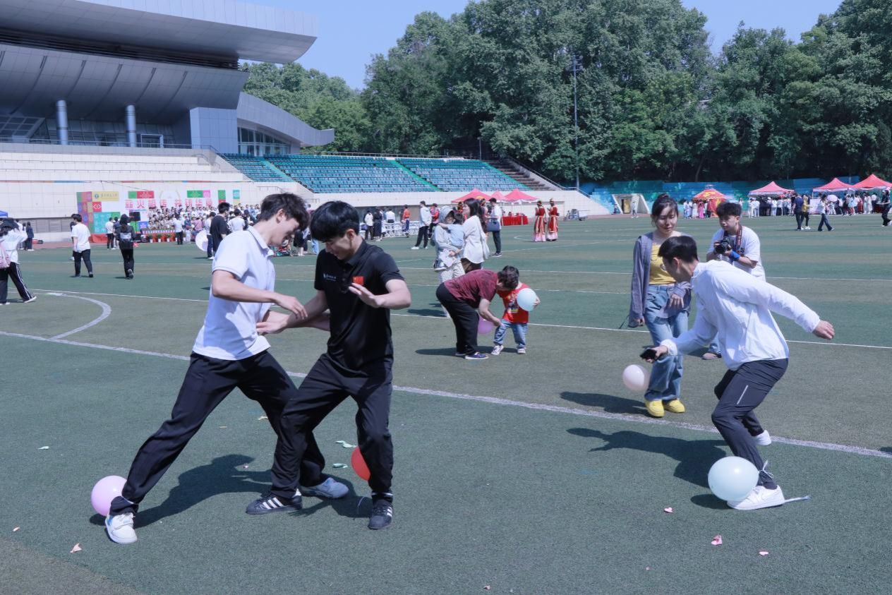 传统回族体育项目“踏脚”在展位焕发新活力,同学们在脚踝处绑上彩色气球,在划定区域内展开 “踩气球大作战”。气球破裂的“砰砰”声此起彼伏,欢笑声与加油声相互交织,这一活动既保留了传统体育的对抗趣味,又融入了现代游戏的欢乐元素。参与者们在奔跑与闪避中感受“踏脚”运动的灵动,更在协作与竞争中踩出了民族团结的美好寓意。