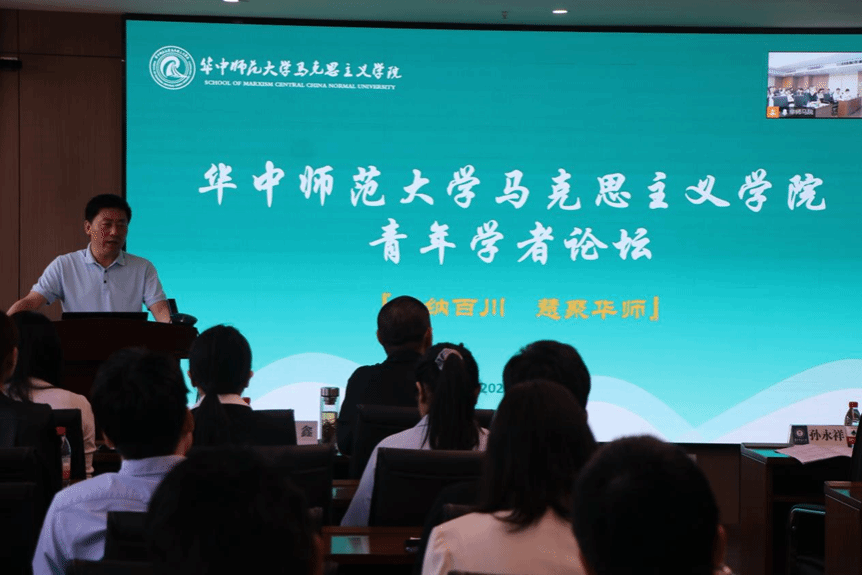 马克思主义学院党委书记孙永祥致辞,他代表学院对来自全国各高校8名博士研究生表示热烈欢迎,强调华中师范大学作为教育部直属的重点综合性师范大学、国家首批“双一流”高校,对人才引进工作十分重视。他向与会青年学者介绍了华中师范大学及马克思主义学院基本情况,重点围绕马克思主义学院学科建设、研究基地等平台建设情况进行了介绍,并向参加本次论坛的青年学者强调选择武汉、选择华中师范大学、选择马克思主义学院的突出优势。 他指出,武汉这座城市科教优势明显,华中师范大学地理位置及拥有的优质基础教育资源突出,华中师范大学马克思主义学院历史悠久、学科底蕴深厚,多学科交叉融合,学术氛围浓厚,鼓动青年学者来桂子山摘“桂”。最后,他强调,华中师范大学马克思主义学院是择业的优质单位,将为各位青年才俊提供一个各自发光、成长的大平台。