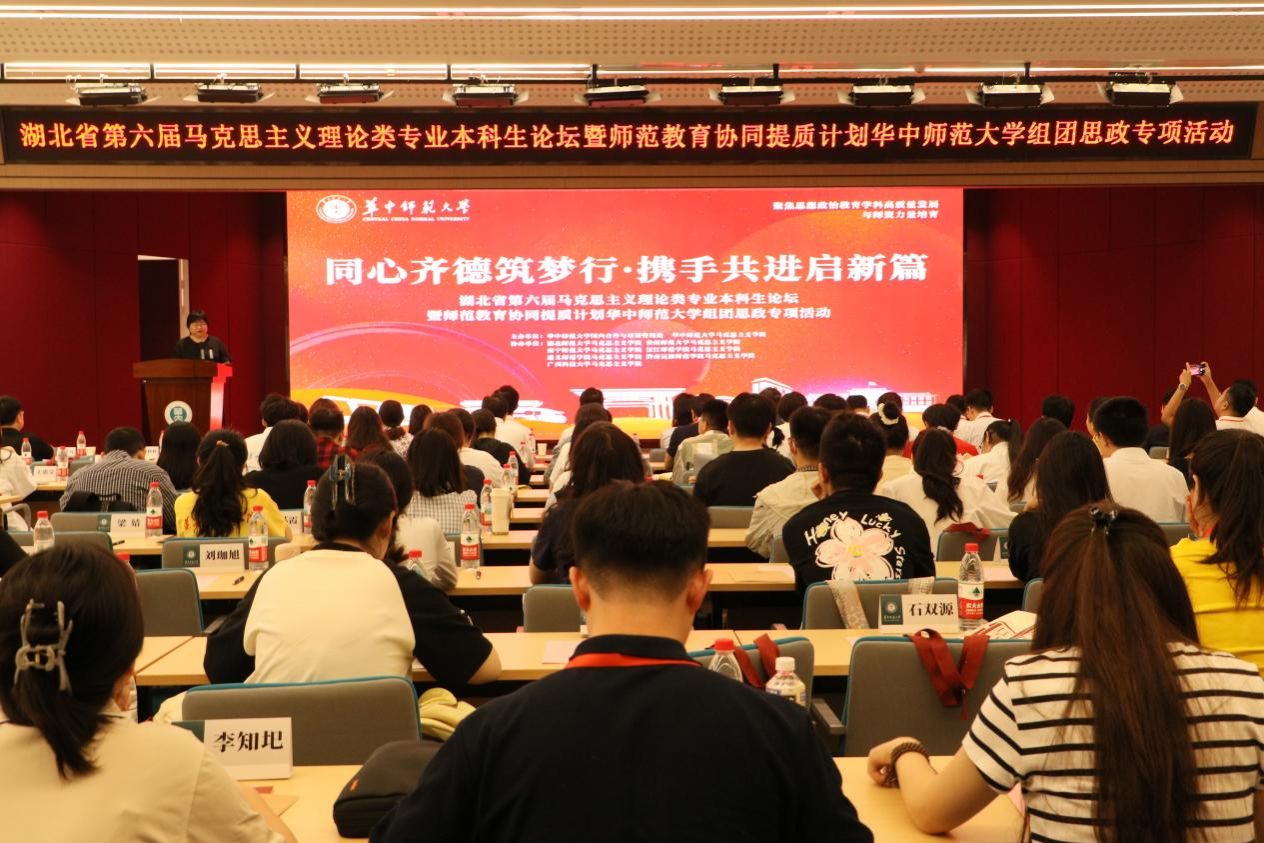 马克思主义学院讯(通讯员 陈晨 蔡晓诗;摄影 侯筱麒 邓小晗 任玉佳 潘依依 刘灏然 王梓桐)为深入学习宣传贯彻党的二十届三中全会精神,提升学科素养与专业能力,扎实推进师范教育协同提质计划,促进师范院校思想政治教育学科高质量发展与师资力量培育,5月17日上午,由华中师范大学马克思主义学院、国内合作与交流管理处主办,华中师范大学习近平新时代中国特色社会主义思想学生研习社(以下简称研习社)承办的“同心齐德筑梦行·携手共进启新篇”湖北省第六届马克思主义理论类专业本科生论坛暨师范教育协同提质计划华中师范大学组团思政专项活动隆重举行。武汉大学马克思主义学院教授杨威、中国地质大学(武汉)马克思主义学院党委副书记武彦斌、长江大学马克思主义学院党委副书记汤慧珍,湖北师范大学马克思主义学院院长唐兴军、党委副书记彭舟,广西科技大学马克思主义学院教授赵芸、贵州师范大学马克思主义学院副院长宋小红、南宁师范大学马克思主义学院党委副书记黄志海、汉江师范学院马克思主义学院党委副书记张玲、遵义师范学院马克思主义学院党委副书记袁婧、华中师范大学国内合作与交流管理处副处长黄志华、华中师范大学马克思主义学院院长毛华兵、教授王世鹏、副教授王寓凡以及全国各高校教师代表出席开幕式。来自全国30多所高校的180余名马克思主义理论类专业本科生、马克思主义学院本科生学生会负责人代表、理论宣讲类社团代表以及党建工作学生样板党支部代表,华中师范大学马克思主义辅导员王海龙、李欣、赵芸逸、韩絮、高源、方倩等及研习社全体成员参会。会议由华中师范大学马克思主义学院党委副书记邵莉莉主持。