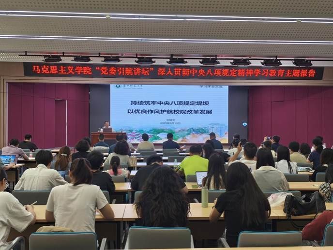刘继文书记首先对中央八项规定精神的核心要义进行了系统性解读,并结合党中央有关要求进一步深入贯彻中央八项规定精神学习教育。他详细阐述了中央八项规定“改进调查研究”、“精简会议活动”等具体内容,点明中央八项规定精神管全党治全党,全体党员干部和公职人员都要严格遵守。同时,刘继文书记通过前后鲜明对比,展现了“中央八项规定何以改变中国”,让师生深刻认识到这一制度出台的重要意义与深远影响。