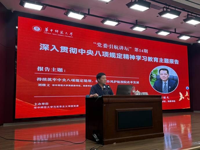 马克思主义学院讯(通讯员 高智俊;摄影 赵慧 高智俊)6月13日,马克思主义学院“党委引航讲坛”第14期举行,华中师范大学党委副书记、纪委书记刘继文以“持续筑牢中央八项规定堤坝,以优良作风护航校院改革发展”为主题,在文科科研楼一楼报告厅为马克思主义学院师生作深入贯彻中央八项规定精神学习教育主题报告。马克思主义学院党政领导班子成员、全体教职工、学生党支部党员代表参加学习。马克思主义学院党委书记孙永祥主持报告会。