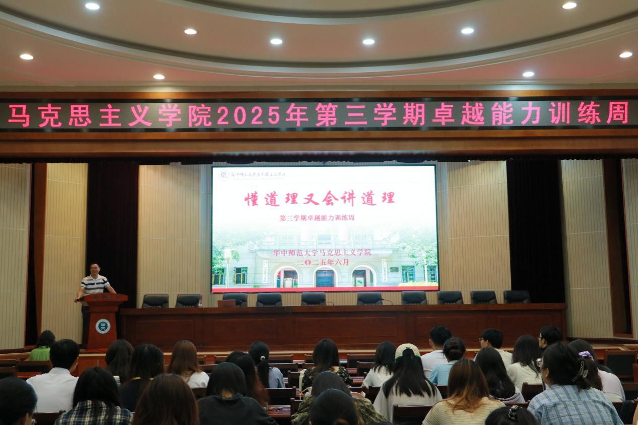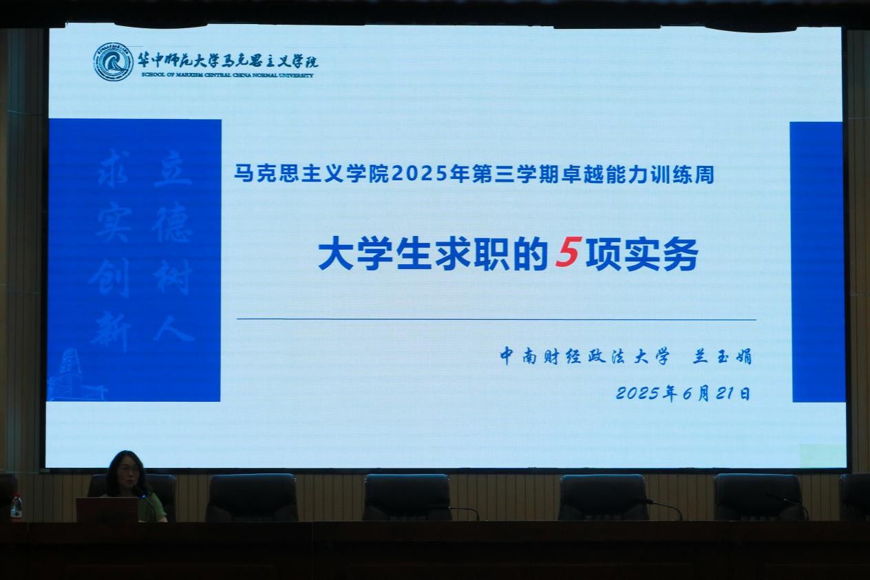 马克思主义学院讯(通讯员 任玉佳;摄影 邓小晗)为解答学生学习与就业问题,培养同学们“懂道理又会讲道理”的卓越能力,马克思主义学院开展2025年第三学期卓越能力训练周活动。第一期“就业指导培训会”于6月21日上午在科学会堂一楼报告厅举办,本次活动由马克思主义学院副院长邵彦涛主持,中南财经政法大学就业指导教研室主任、湖北省高校就业创业指导专家委员会委员兰玉娟副教授主讲,2022、2023、2024级本科生参与。