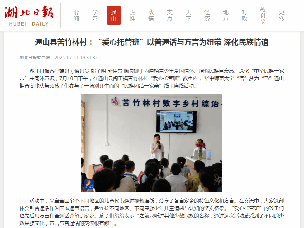 此次活动由共青团通山县委指导,华中师范大学“语”梦为“马”通山推普实践队联合华中师范大学恽代英青年讲师团、“丝路·逐梦”实践队、第二十七届研究生支教团,以及广州大学第十五批援藏支教大队共同举办。活动由华中师范大学“语”梦为“马”通山推普实践队成员黄梅鑫主持,鄂、藏、新三地近百名青少年在全国各地同步参与。作为跨地域民族团结教育的创新实践,活动获《湖北日报》关注报道,展现了青年学子推动民族文化交融的积极成效。