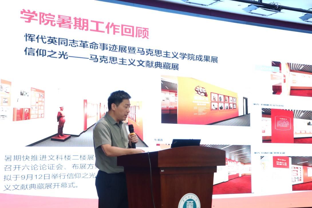此次会议对学院暑期工作时行了全面总结,对暑期热点事件进行了回顾和剖析,强调了师德师风建设,部署了新学期重点工作,对新学期教学、科研、人才培养、理论宣传、师德师风建设、学院文化建设等提出了明确要求。学院将继续扎实推进重点马克思主义学院建设各项工作,确保新学期学院各项工作稳步推进、提质增效。