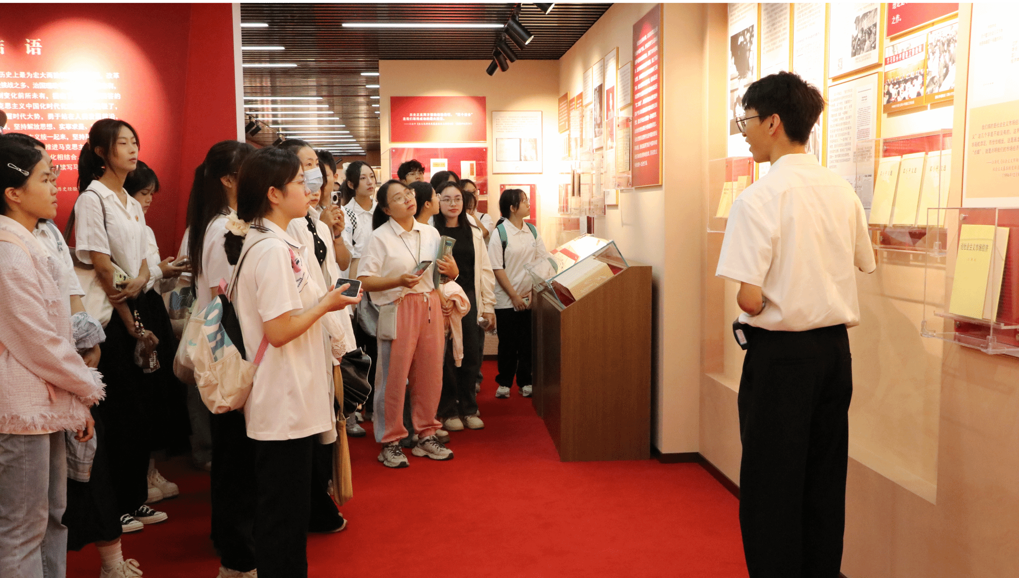 活动伊始,与会师生代表共同参观了“信仰之光——马克思主义文献典藏展”,参观期间,解说员向师生介绍了马克思主义经典著作的创作背景、传播历程,并解读“两个结合”重大命题的思想渊源,丰富的文献史料也让师生沉浸式感悟马克思主义发展历程。此次参观为参与师生提供了直观的理论学习场景,为后续“专业第一课”及座谈会的开展奠定了坚实的思想基础。