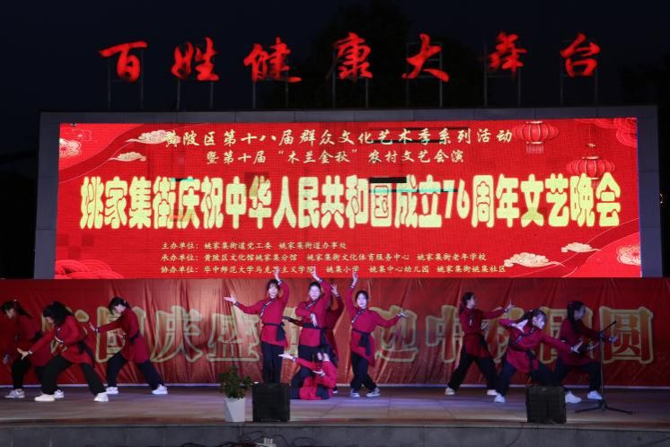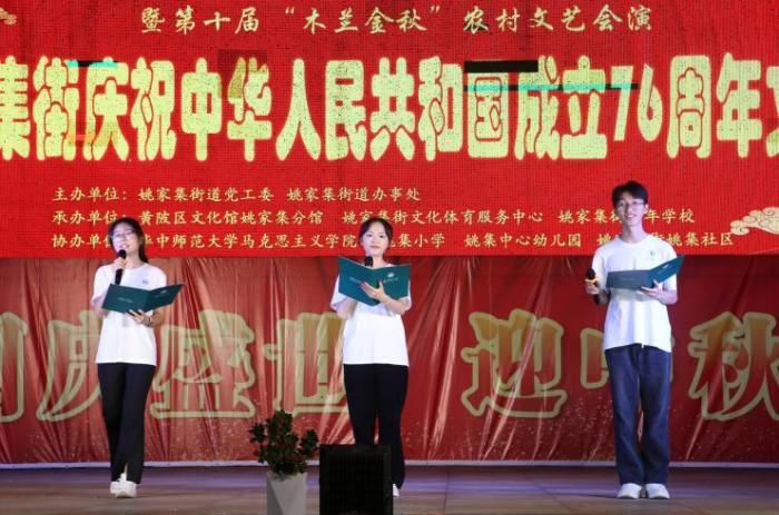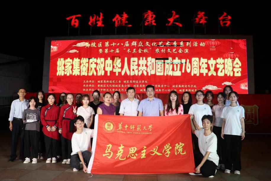 马克思主义学院讯(通讯员 刘灏然 韩絮;摄影 刘灏然)金秋九月,丹桂飘香。在中华人民共和国成立76周年即将到来之际,9月29日,马克思主义学院副处职组织员刘方、专职辅导员韩絮带领学院学生,赴学院“理论热点面对面”实践基地——黄陂区姚家集街道,参加黄陂区第十八届群众文化艺术季系列活动之“庆祝中华人民共和国成立76周年”文艺晚会。