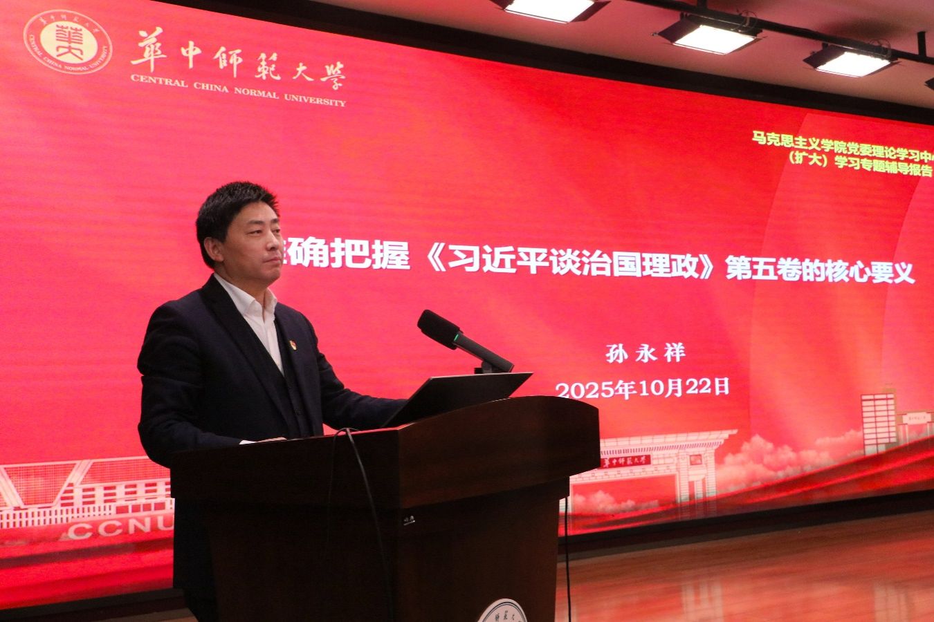 学院党委书记孙永祥作《准确把握〈习近平谈治国理政〉第五卷的核心要义》的主题报告进行领学。