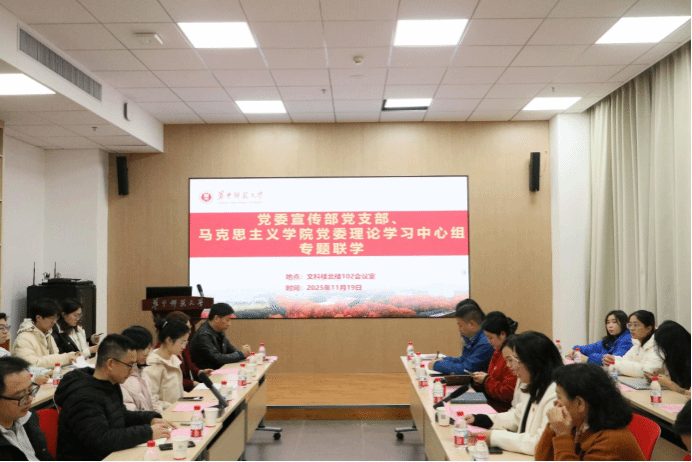 马克思主义学院讯(通讯员 彭源粟;摄影 陈奕凝)11月12日,华中师范大学党委宣传部党支部、马克思主义学院党委理论中心组专题联学在文科综合楼102会议室举行。宣传部党支部全体党员、马克思主义学院理论学习中心组成员、习近平新时代中国特色社会主义思想概论教研部党支部党员、马克思主义学院融媒体中心学生党员参加会议。会议由党委宣传部常务副部长、党委宣传部党支部书记秦恒主持。活动分两个阶段进行。