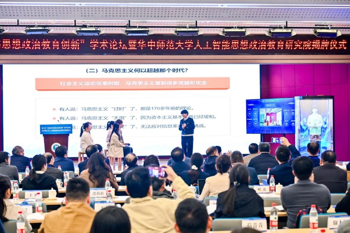 华中师范大学人工智能思想政治教育研究院执行副院长、马克思主义学院教授薛惠代表研究院发布了的“博雅思政大模型”,该模型设有五大平台:思政信息聚合与发布平台、高校思政课数字教学资源与应用平台、大中小学思政课一体化建设与教学平台、思想政治教育质量综合评价与反馈平台、实践活动与育人服务平台等,提供精准服务、沉浸式教学、全学段资源整合等多元思政服务。在成果展示阶段,演示了思想政治理论课教师智能体融入思政课教学场景。全国模范教师、华中师范大学马克思主义学院丁茜老师与自己的数字分身“华小茜”共同演示“马克思主义基本原理”教学示范课,数字人实时答疑,全场域多屏互动,“师——生——数字人”三者互动频繁,呈现沉浸式教学课堂新范式、新场景。