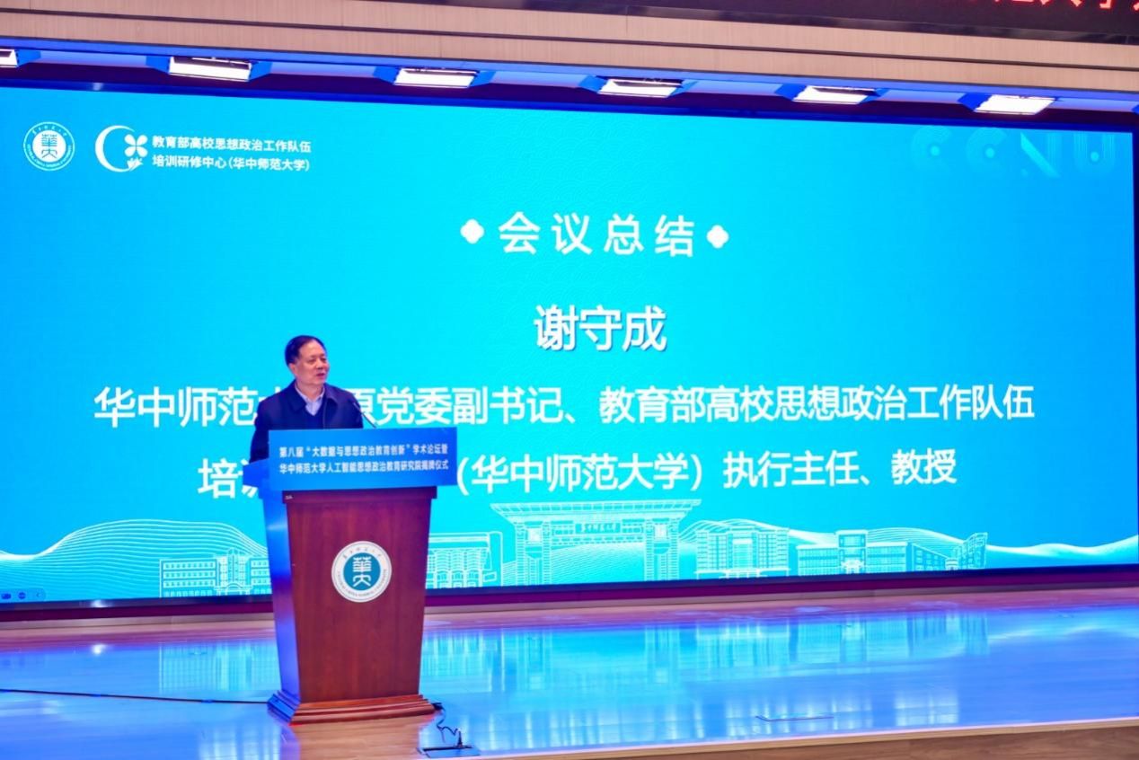 华中师范大学原党委副书记、教育部高校思想政治工作队伍培训研修中心(华中师范大学)执行主任、教授谢守成作总结报告。指出本次论坛具有四大特点:坚持问题导向、聚焦现实真问题;立足国家战略、凸显前沿创新;研究内容持续深化、专家长期深耕;交叉融合特征显著、推动数字技术与思政教育深度融合。他强调,党的二十届四中全会将科技创新置于中国式现代化核心位置,本次论坛的举办与人工智能思想政治教育研究院的成立正是对此的生动实践,期待学界积极拥抱智能时代,共同探究大数据与思政教育创新本源问题,为学科发展注入新动能。
