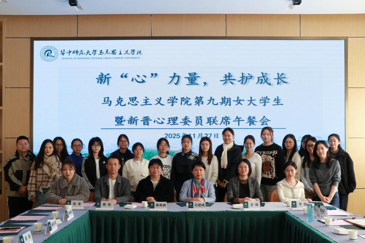 马克思主义学院讯(通讯员 喻童欣;摄影 喻童欣)11月27日,为提升新生心理委员专业素养与工作能力、搭建朋辈助人交流平台,马克思主义学院第九期女大学生暨新晋心理委员联席午餐会在华中师范大学桂子山校区桂香园三楼桂花厅举行。华中师范大学党委学生工作处副处长吴建成,马克思主义学院党委副书记邵莉莉,生命科学学院辅导员兼心理联络员、心动力成长工作室主持人余璇,心理健康中心专职教师骆贵,马克思主义学院辅导员兼心理联络员韩絮,第七届、第八届全国心理委员论坛副主席宋嘉雯以及2025级本科生和研究生新晋心理委员参加本次会议。马克思主义学院团委书记李欣主持本次会议。