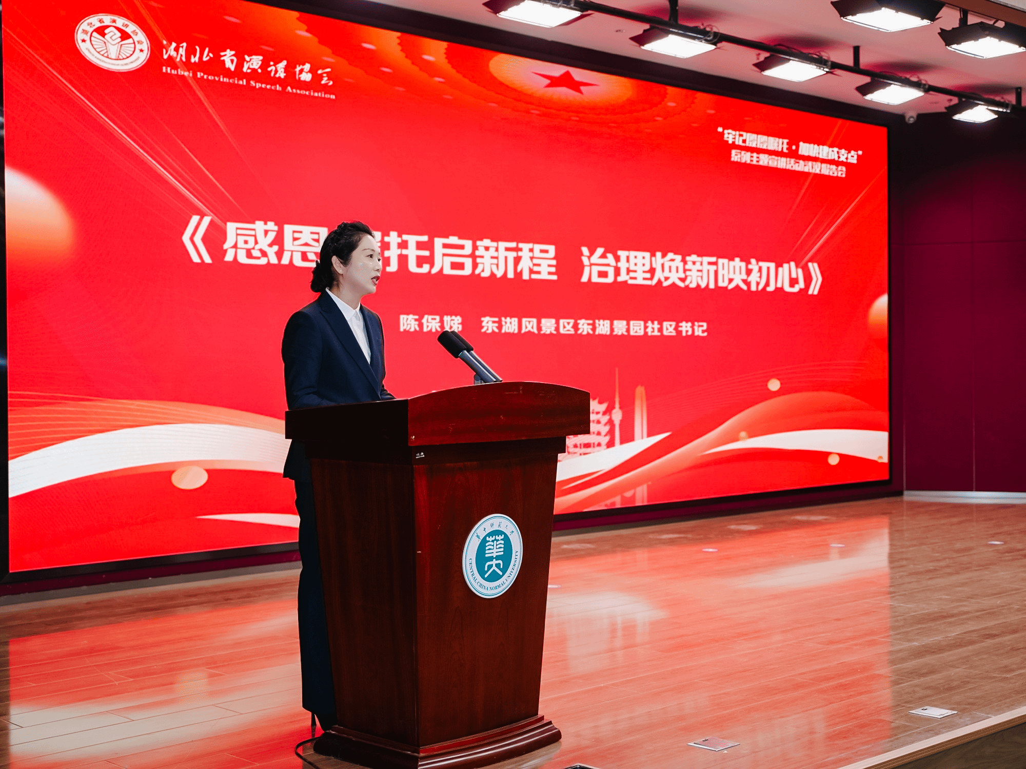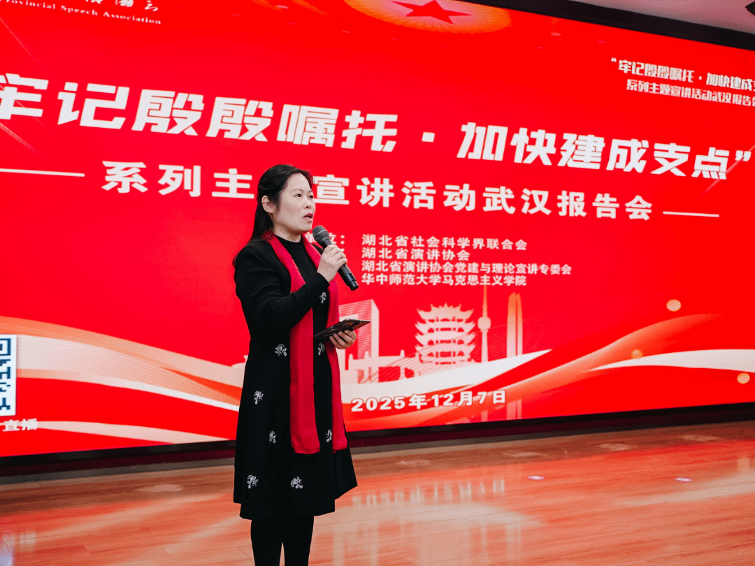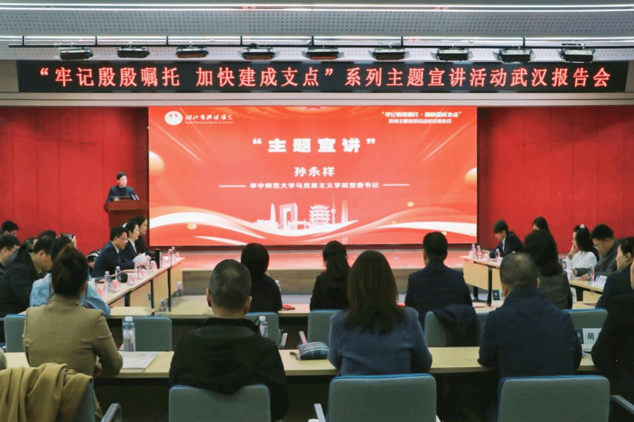 马克思主义学院讯(通讯员 陈奕凝 蒋林杉;摄影 夏兴达 张洁 彭源粟)12月7日,“牢记殷殷嘱托,加快建成支点”系列主题宣讲活动武汉报告会在华中师范大学文科科研楼一楼报告厅顺利举行。本次活动由湖北省社会科学界联合会指导,湖北省演讲协会主办,湖北省演讲协会党建与理论宣讲专委会、华中师范大学马克思主义学院联合承办,聚焦政策传达、经验分享与精神传承,凝聚奋进力量。湖北省社会科学界联合会主席赵凌云、湖北省社会科学界联合会副主席舒敏、湖北省社会科学界联合会学会工作部主任陈弘、湖北省社会科学界联合会学会工作部副主任伍静、湖北省演讲协会会长陈飞、湖北党建与理论宣讲专委会主任、华中师范大学马克思主义学院党委书记孙永祥以及来自全省理论界、教育界、基层治理、产业一线等代表近200人齐聚一堂,共话使命担当,共谋支点未来。