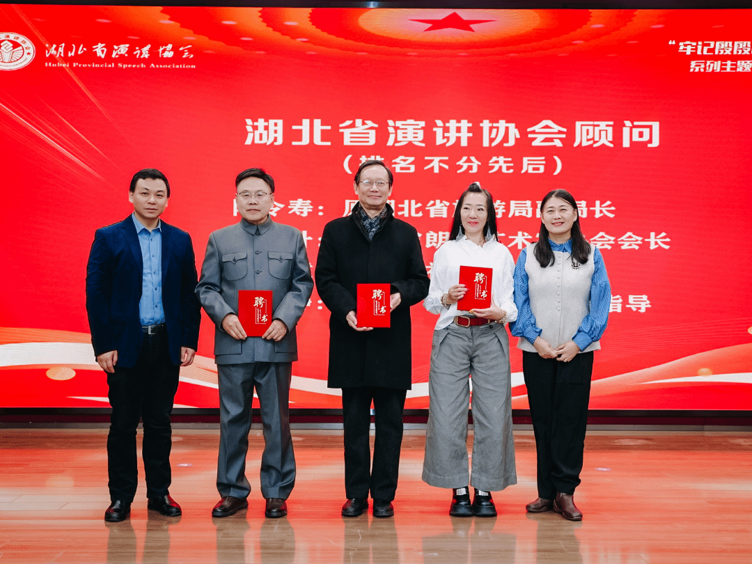 活动现场还举行了聘任仪式,依次完成湖北省演讲协会顾问聘任、“红脚印宣讲团”导师及宣讲员聘任。原湖北省旅游局副局长陆令寿、湖北省礼仪学会会长李荣建等受聘为协会顾问,省演讲协会副会长、江汉大学马克思主义学院党委书记吕鸿雁,省演讲协会监事长、汉阳区政协委员曹辉为顾问颁发聘书。