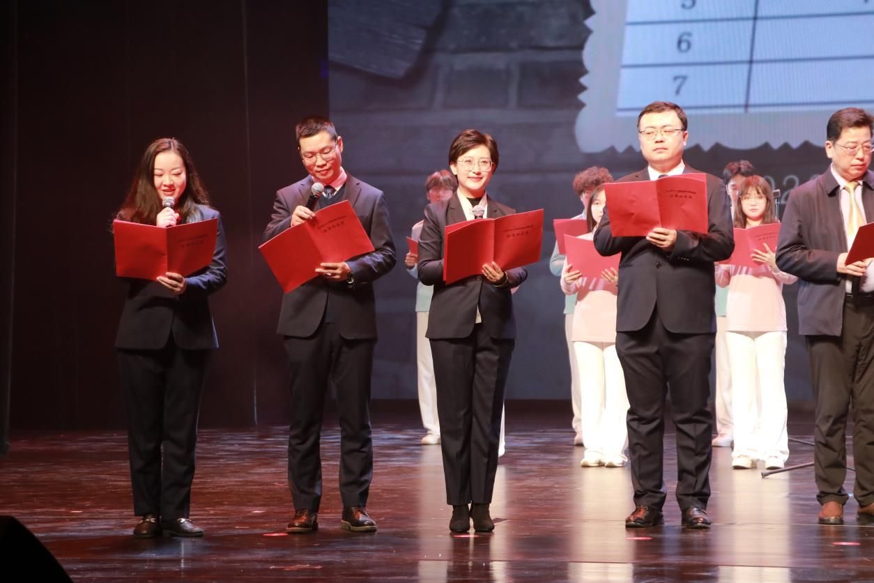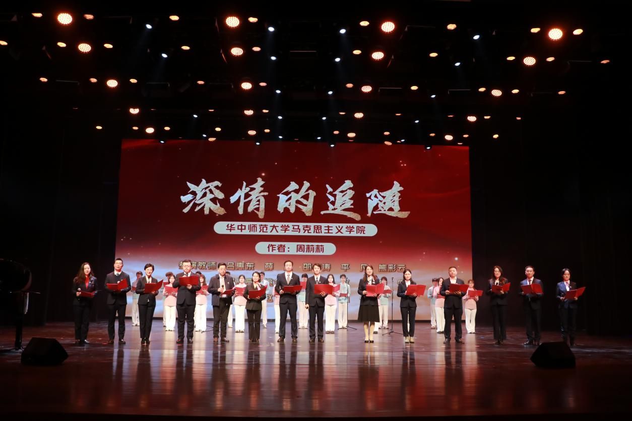 该作品以“历史·红色的基因”“传承·桂子山上的传薪者”“赓续·奋进新时代”为三大篇章,串联起学院从1949年中原大学政治系走来的七十余载峥嵘征程。舞台上,朗诵者们或沉稳诉说、娓娓道来,或激昂抒怀、铿锵有力,从马院“红色基因的新生儿”呱呱坠地的初心起点,到学院老一辈教师以一生刻度镌刻信仰的坚守,再到一代又一代马院人与新时代脉搏同频共振的奋进,字字句句皆饱含对思想政治教育事业的深情。师生合诵的段落里,“桂子山的灯火永远年轻滚烫”的誓言响彻会场,将马院人七十余载拓荒、筑桥、逐光的历程凝练成厚重的“信仰”二字。师生们用饱含深情的演绎,传递着马院人爱党爱国的赤诚情怀与立德树人的使命担当,让在场者真切触摸到学院一脉相承的精神力量,充分展现了马院教职工深耕学科建设、坚守育人初心的精神底色。