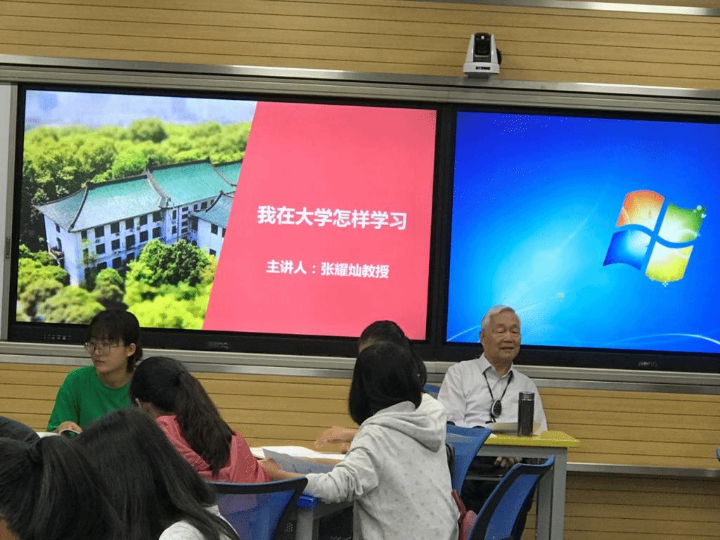 张教授通过分享老照片的故事向同学们介绍自己的主要经历,闲话家常的亲近语言拉近了与学生的距离,其中一张游览武汉长江大桥的照片更是赢得学生们的阵阵掌声。张耀灿先生接着从五个方面展开讲述在大学的学习经历:一是要十分珍惜大学生活,二是学会自学、学会读书,三是要坚持研究型学习,四是既要学习当领导、也要学会被领导,五是健康第一、学习第二。随后,张教授寄语青年学生:“热爱是最好的老师,学好马克思主义理论,才能扣好人生的第一粒扣子、也才会有更强大的动力的毅力学好专业,做一个全面发展的大学生。”