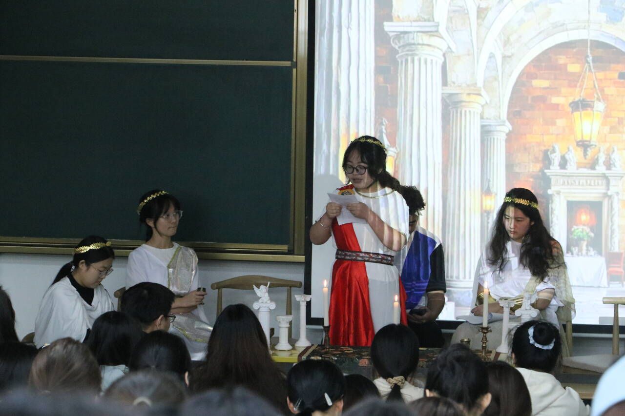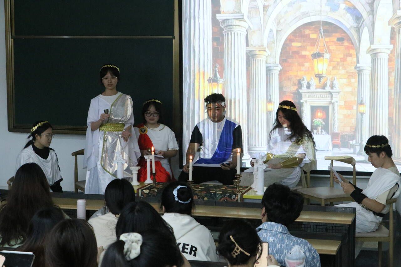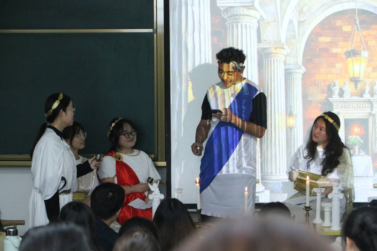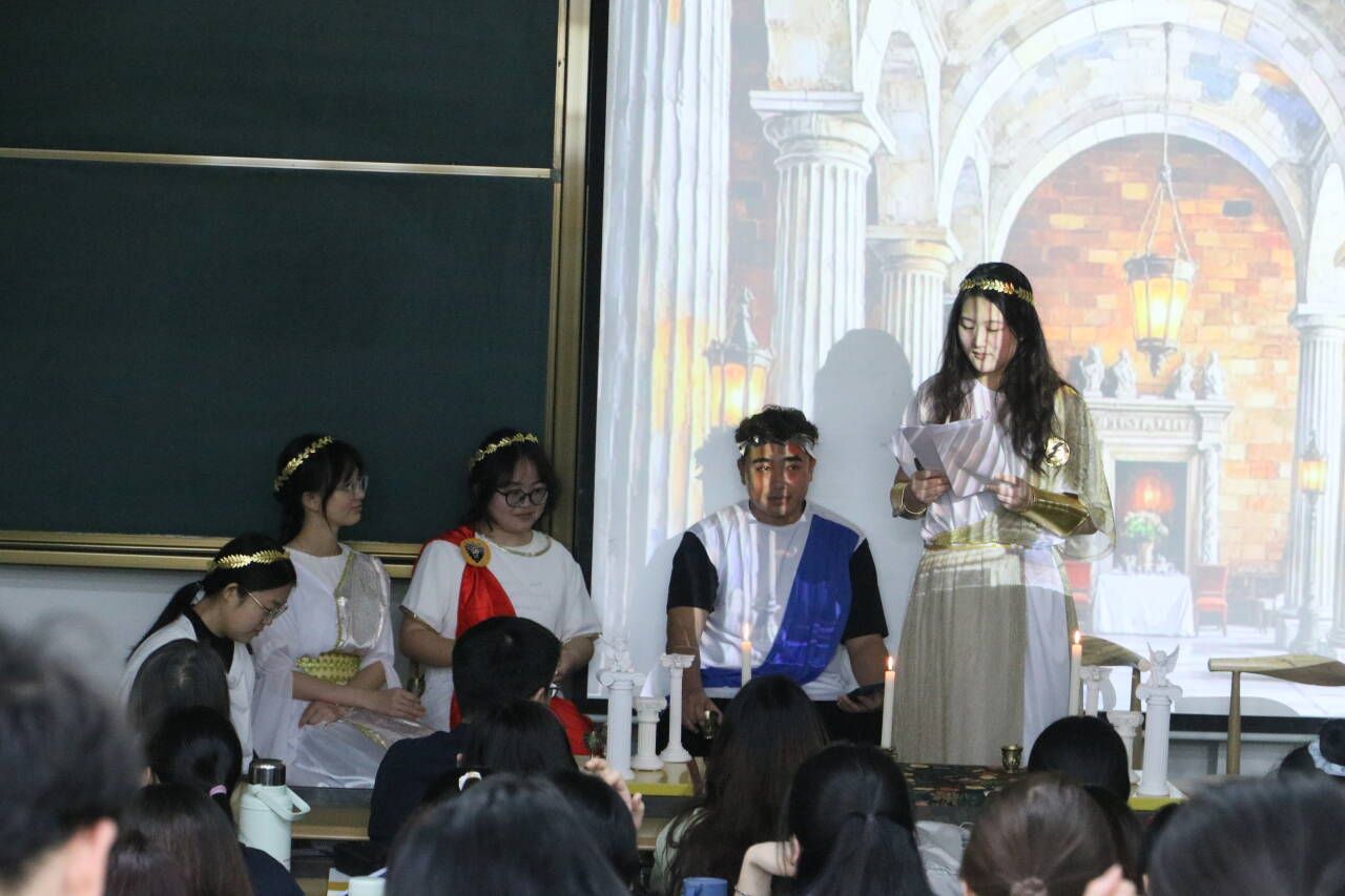 整场话剧表演生动地再现了《会饮篇》中关于爱的多元探讨,同学们通过角色扮演深入理解了柏拉图笔下爱的哲学。这种创新的教学方式不仅激发了学生对西方哲学的兴趣,也培养了学生的团队协作与艺术表达能力。
