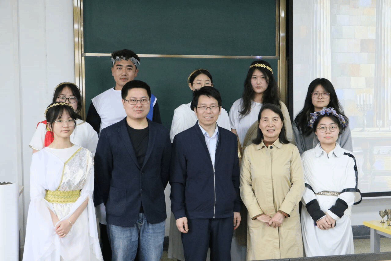马克思主义学院讯 (通讯员 刘佳芳;摄影 任玉佳)4月7日,马克思主义学院所开设的《西方哲学史》课上,一场以柏拉图所著《会饮篇》为主题的话剧表演精彩呈现。龙静云教授、王世鹏教授、张智老师等参与此次活动,马克思主义学院副院长邵彦涛线上观摩此次活动。同学们身着古希腊风格服饰,生动再现了宴会上关于“爱”的探讨,展现了哲学经典与艺术表演的结合。