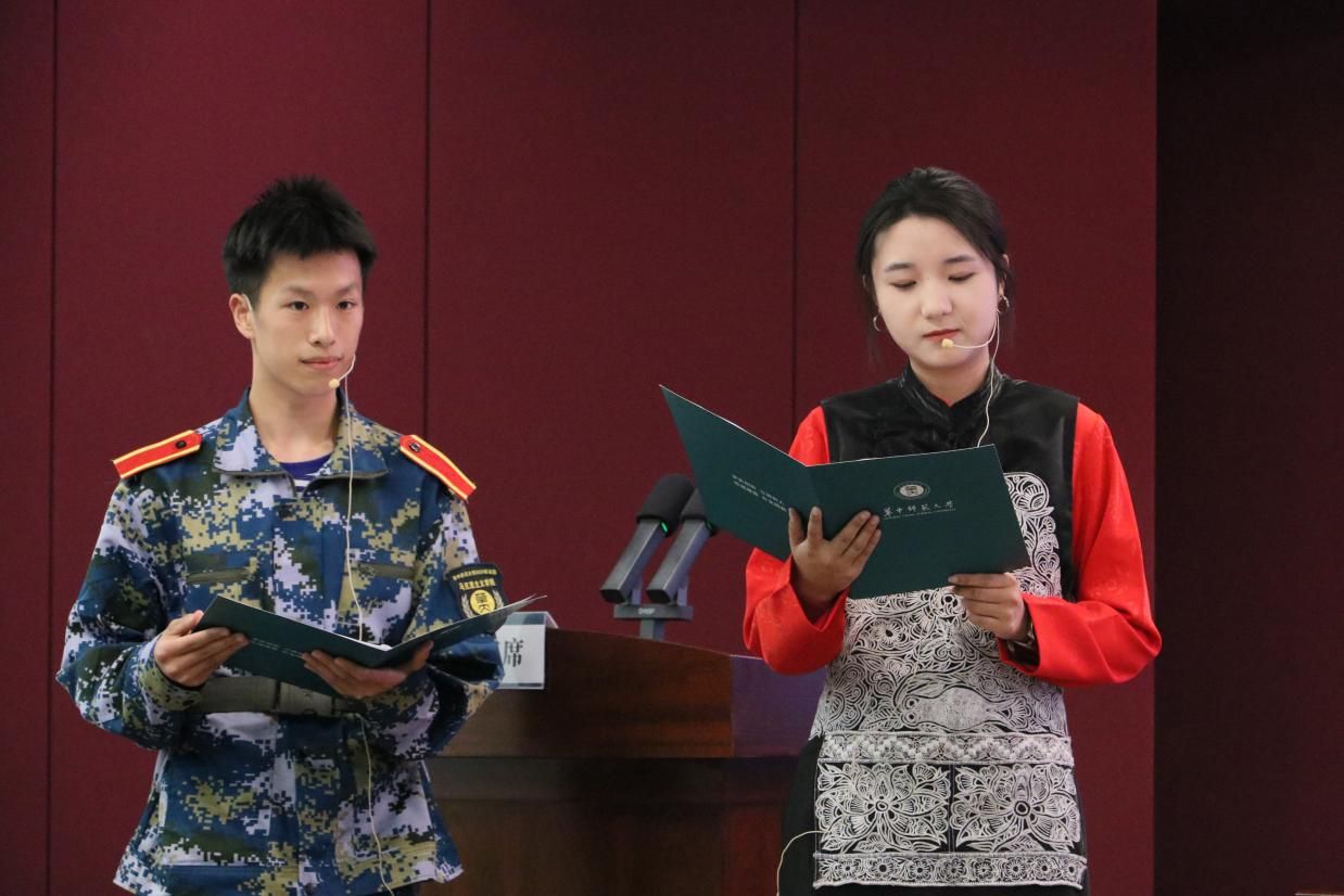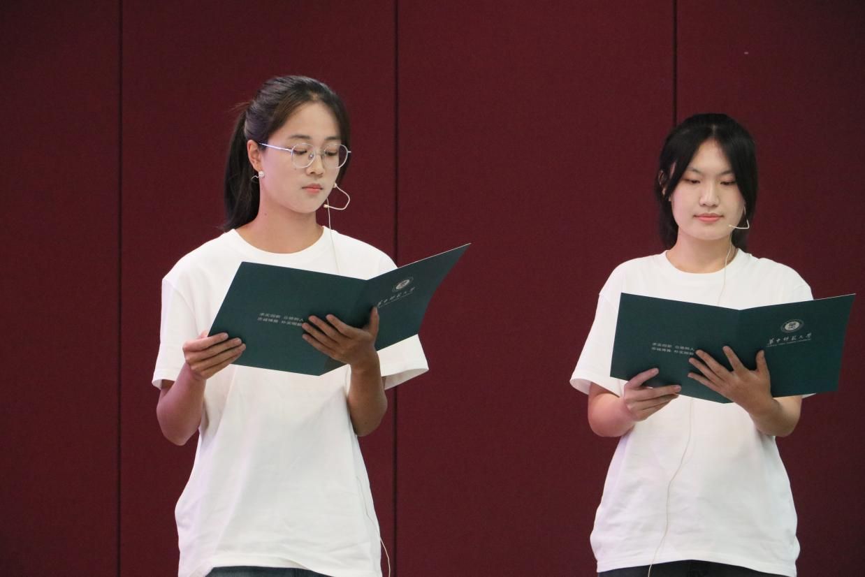 学院2025级本科新生代表彭源粟、孙凡迪、梁立博、袁本博共同发言。同学们围绕坚韧的意志、选择的勇气、传承的信念、团结的力量等主题进行朗诵,表示将保持昂扬奋进的姿态,开启崭新的大学生活。
