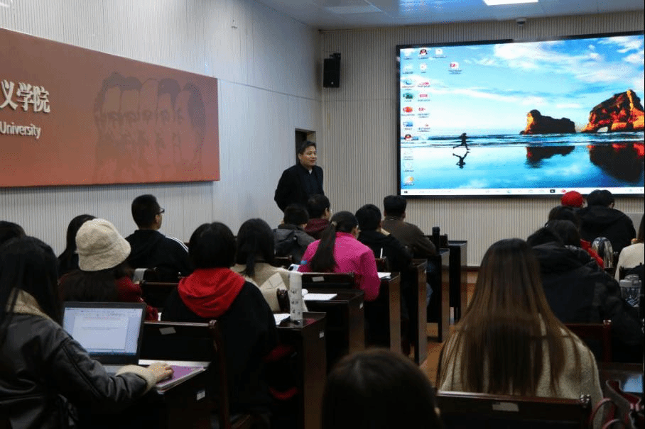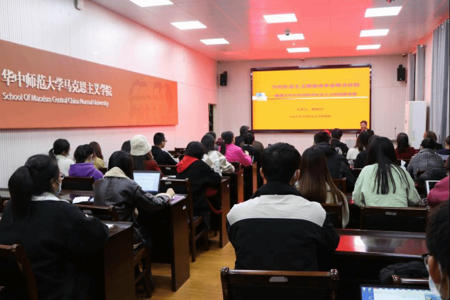 马克思主义学院讯(通讯员 马雪梅;摄影 田睿)2020年11月21日晚7点,由华中师范大学马克思主义学院主办、马克思主义学院研究生会承办的华大马克思主义讲坛第十四期于1号楼三楼报告厅顺利进行。本次讲座的主题为“当代社会主义国家改革开放的态势及比较”,由山东大学政治学与公共管理学院教授、博士生导师崔桂田教授主讲,马克思主义学院副院长毛华兵老师主持。马克思主义学院部分老师和同学到场聆听。