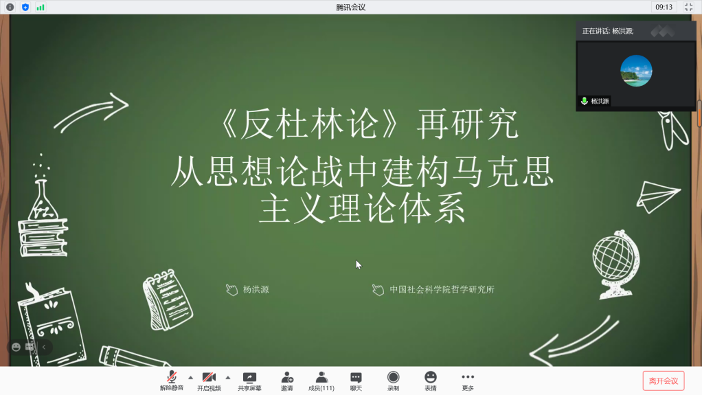 马克思主义学院讯(记者 陈思;马雪梅)2020年11月22日上午9点,由华中师范大学研究生会和马克思主义学院主办、马克思主义学院研究生会承办的华中师范大学“马克思主义生态文明观及其中国化研究”青年学术创新团队学术沙龙第十一期顺利举行。本次讲座采取腾讯会议的形式,由中国社会科学院哲学研究所副研究员、哲学博士杨洪源老师主讲“《反杜林论》再研究:从思想论战中建构马克思主义理论”,华中师范大学马克思主义学院副教授戴圣鹏老师主持,我院百余名同学线上聆听了本次讲座。