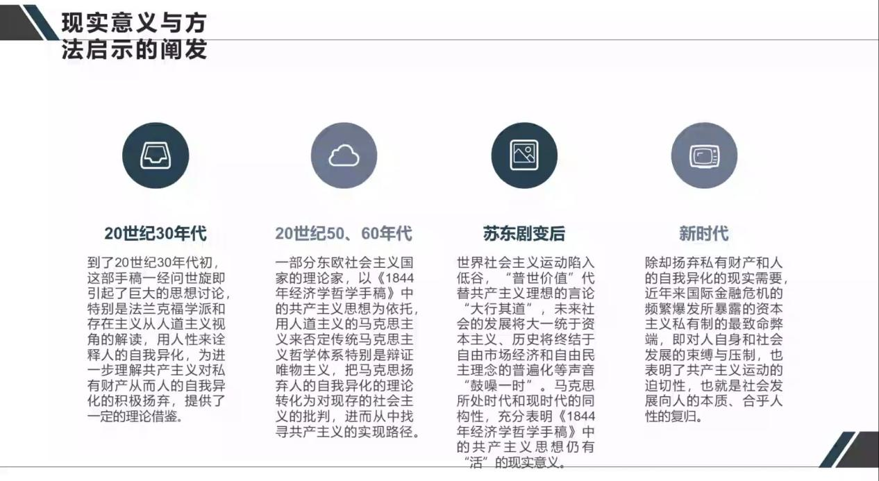 讲座伊始,杨洪源老师指出,哲学史就是哲学、思想史就是思想,文本学研究是对马克思主义哲学研究的‘史’‘论’‘著’相统一的学术传统之延续与发展,对马克思主义哲学研究起着基础作用。随后,杨洪源老师以《1844年经济学哲学手稿》中关于共产主义的论述为根据,从文本原貌与内在逻辑的呈现、历史脉络与思想演进的把握、基本原理与重要命题的重释、现实意义与方法启示的阐发四个方面讲授本次讲座的主要内容,通过具体解读马克思所作的七条论证得出其内在逻辑,并梳理共产主义思想及其流派的发展进程,从而结合文本的具体语境对共产主义思想做出新的阐释。最后,杨老师强调,思想与现实是密不可分的,它们作为同一事物的相互依存的两个方面而存在,现实问题的解决即现实意义是思想阐释的题中应有之义,文本学研究中的思想阐释也不例外。