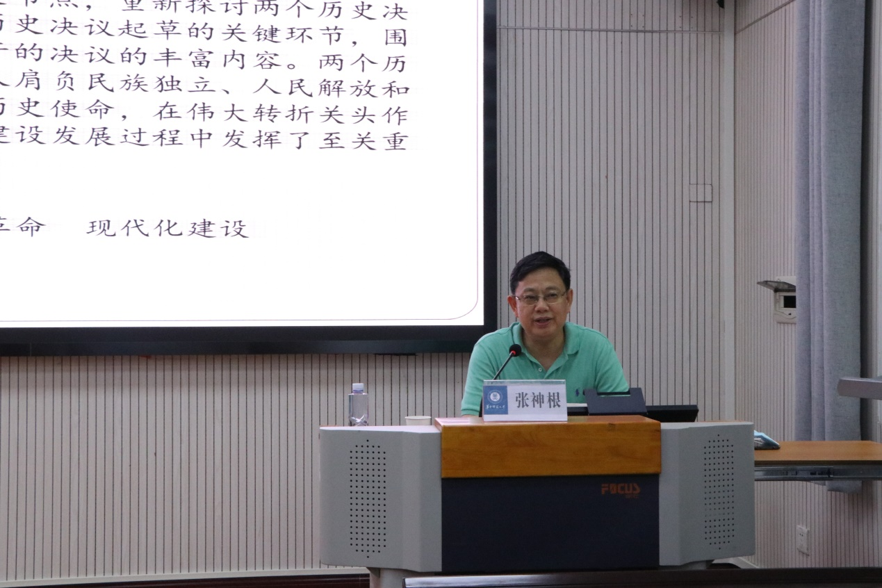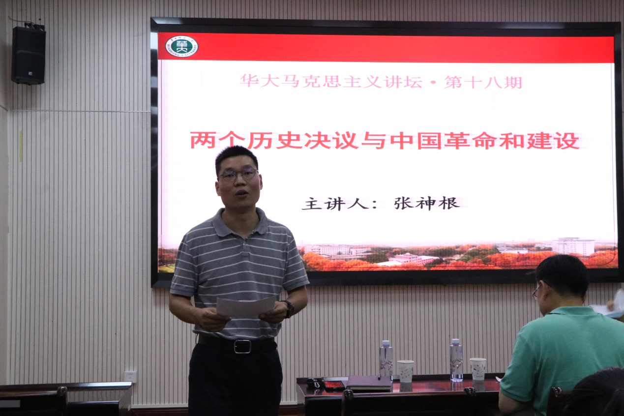 马克思主义学院讯(记者 沈沫;摄影 郭蓉)2021年6月21日下午2时30分,由华中师范大学马克思主义学院主办、马克思主义学院研究生会承办的“华大马克思主义讲坛”第十八期在1号楼三楼报告厅顺利举行。本次讲座邀请到历史学博士、中共党史和文献研究院第四研究部主任、研究员张神根,带来主题为“两个历史决议与中国革命和建设”的精彩报告。讲座由华中师范大学马克思主义学院副院长邵彦涛主持,我院部分老师和学生到场聆听,座无虚席。